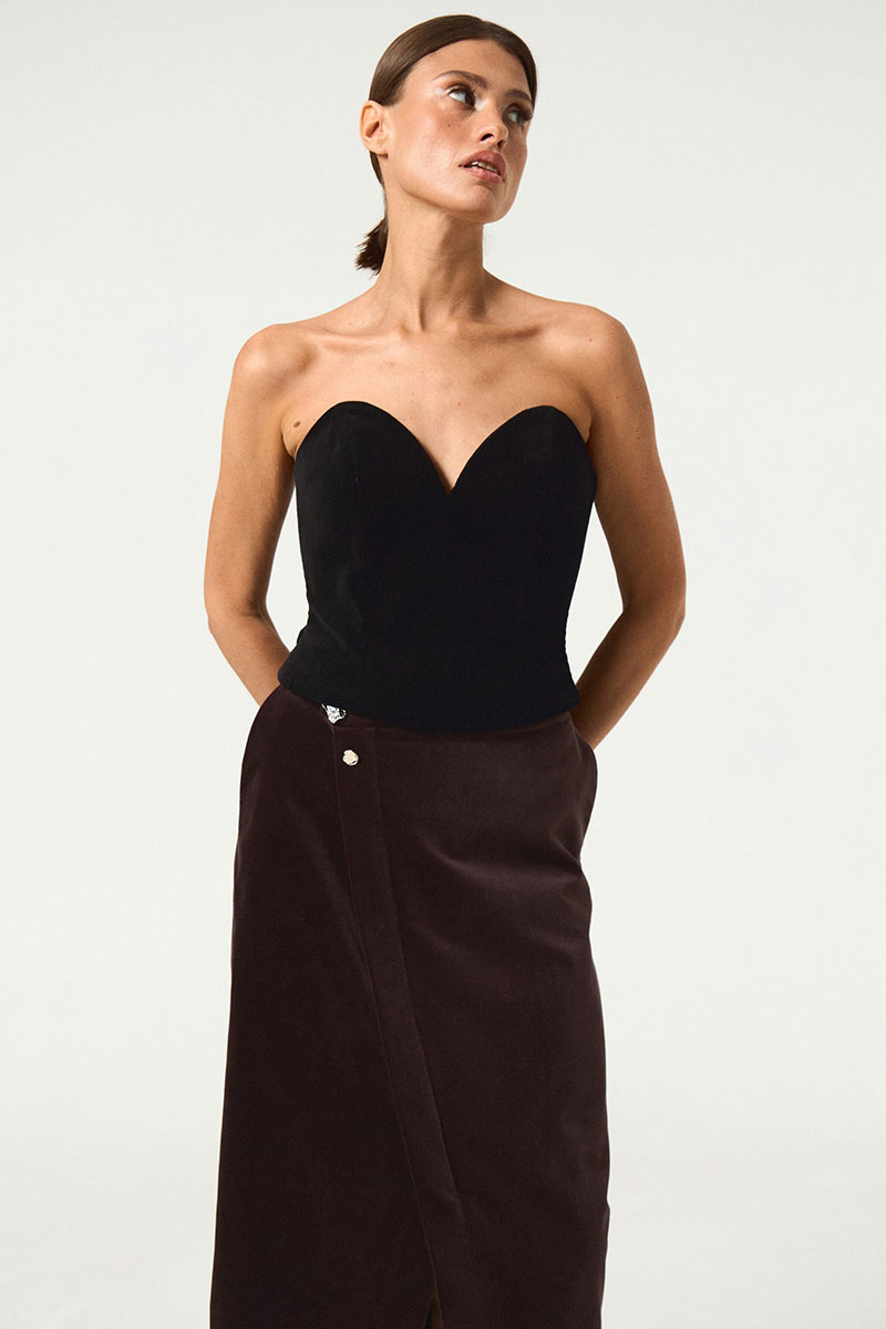 Юбка из ткани с эффектом бархата. По левой стороне юбки разрез, юбка на запах, декорирована тремя декоративными пуговицами. Юбка на поясе. В запахе изделия пзастежка на молнию.