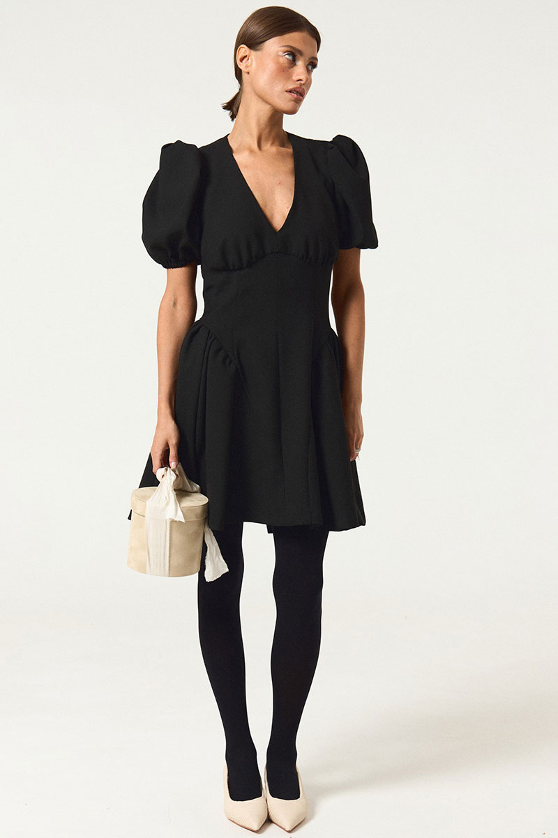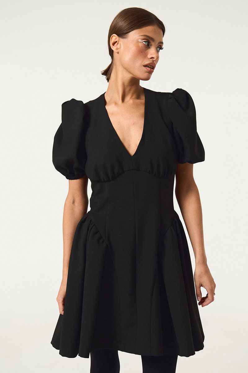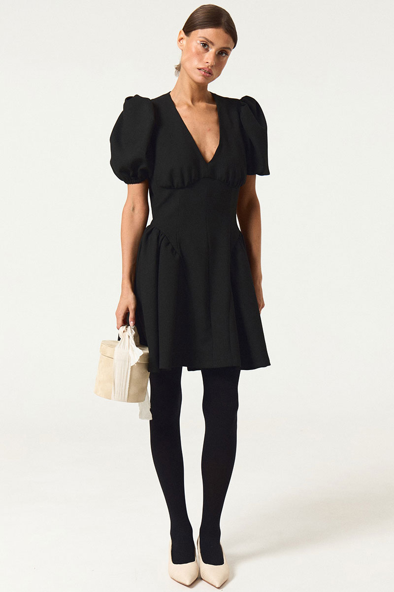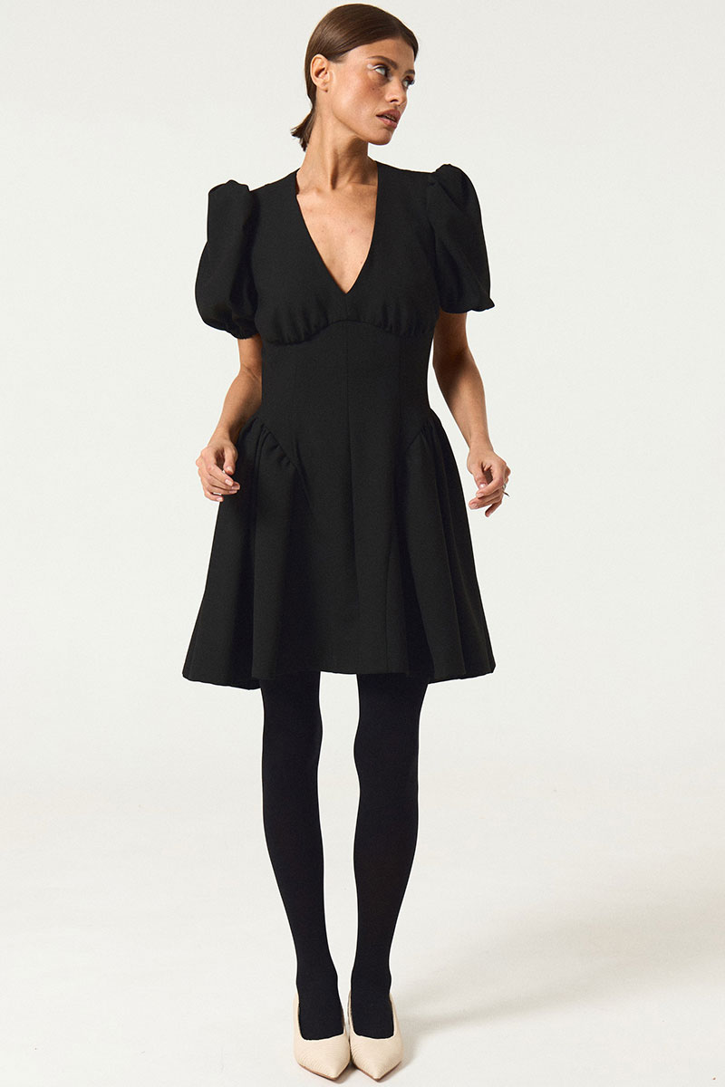 Платье приталенного силуэта с расширенной юбкой книзу. По переду и спинке платья вытачки. В среднем шве спинки застежка на потайную молнию. По переду платье отрезное под линии груди.По среднему шву переда декоративные пуговицы. Вырез горловины V-образный. Воротник отложной.