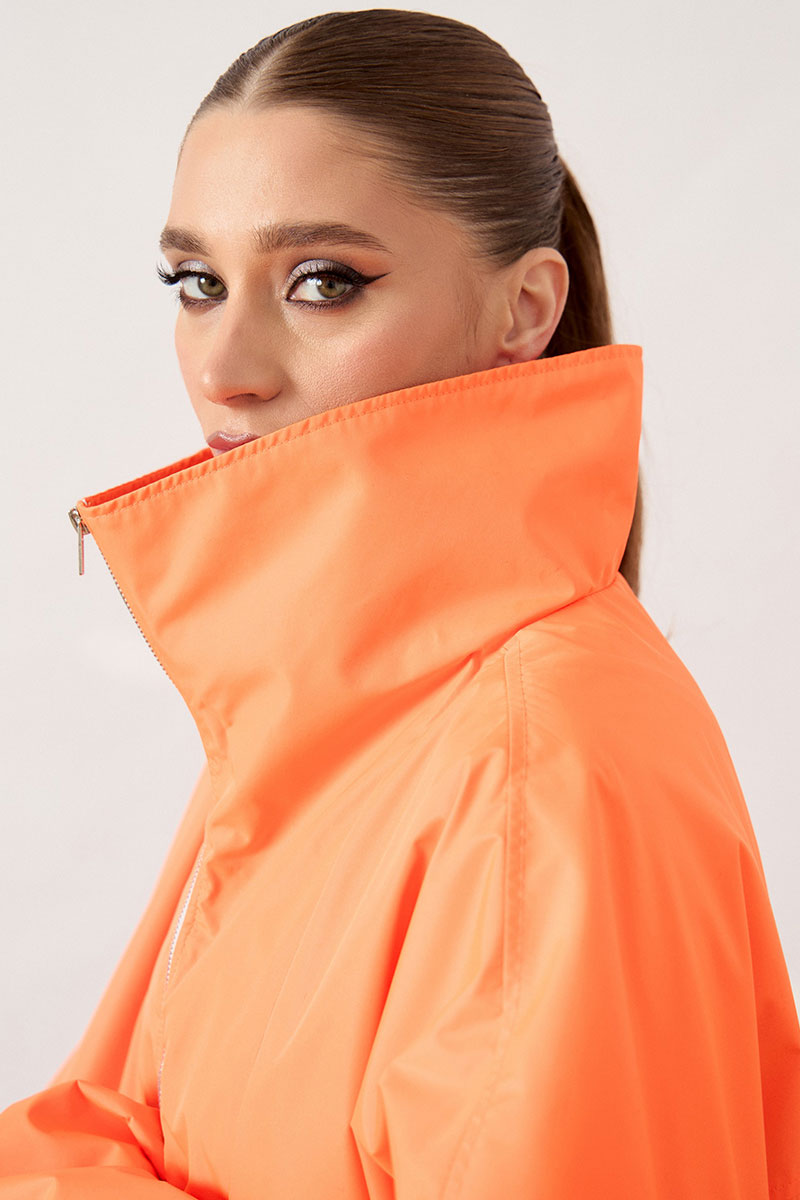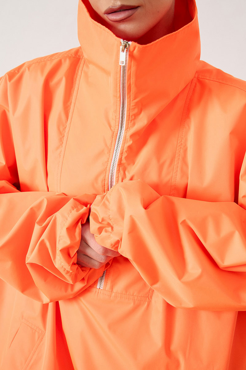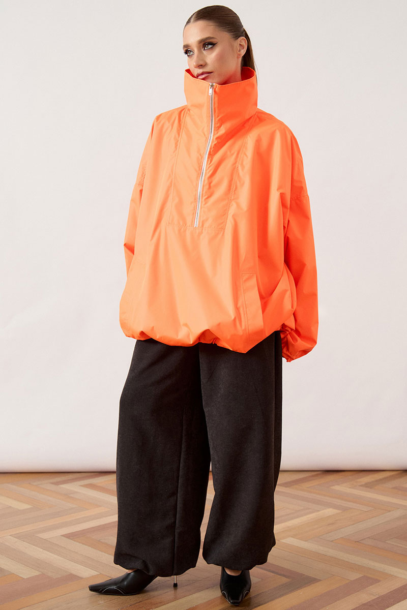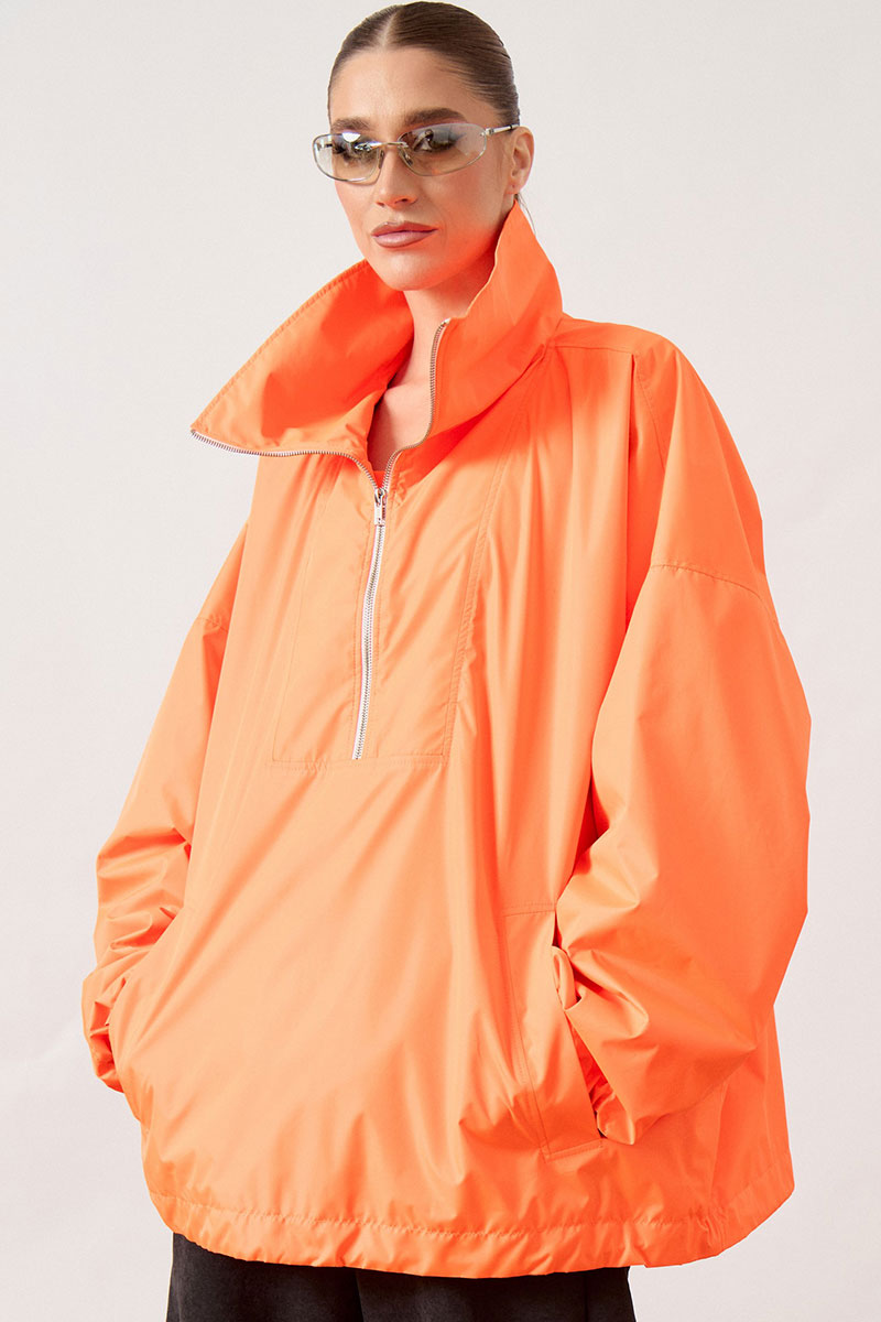 Анорак женский, свободного силуэта, из плотной плащевой ткани. Изделие со спущенной линией плеча и воротником-стойкой. Перед с отрезной кокеткой и центральной застежкой на молнию до середины груди. В нижней части переда расположен накладной карман «кенгуру» с наклонным входом. Спинка цельнокроеная, удлиненная относительно переда. Рукав широкий, одношовный, втачной, по низу собран на эластичную тесьму (резинку). Низ изделия свободный, с небольшим расширением к низу.