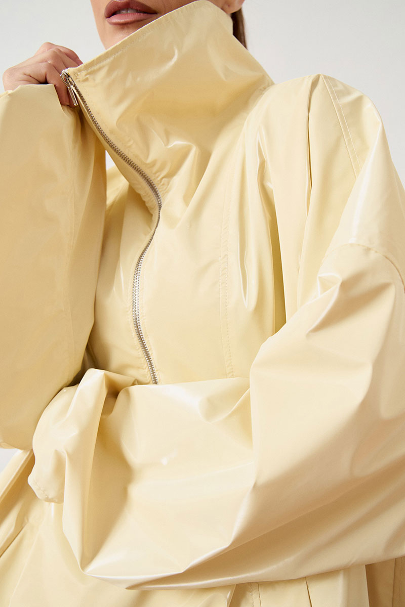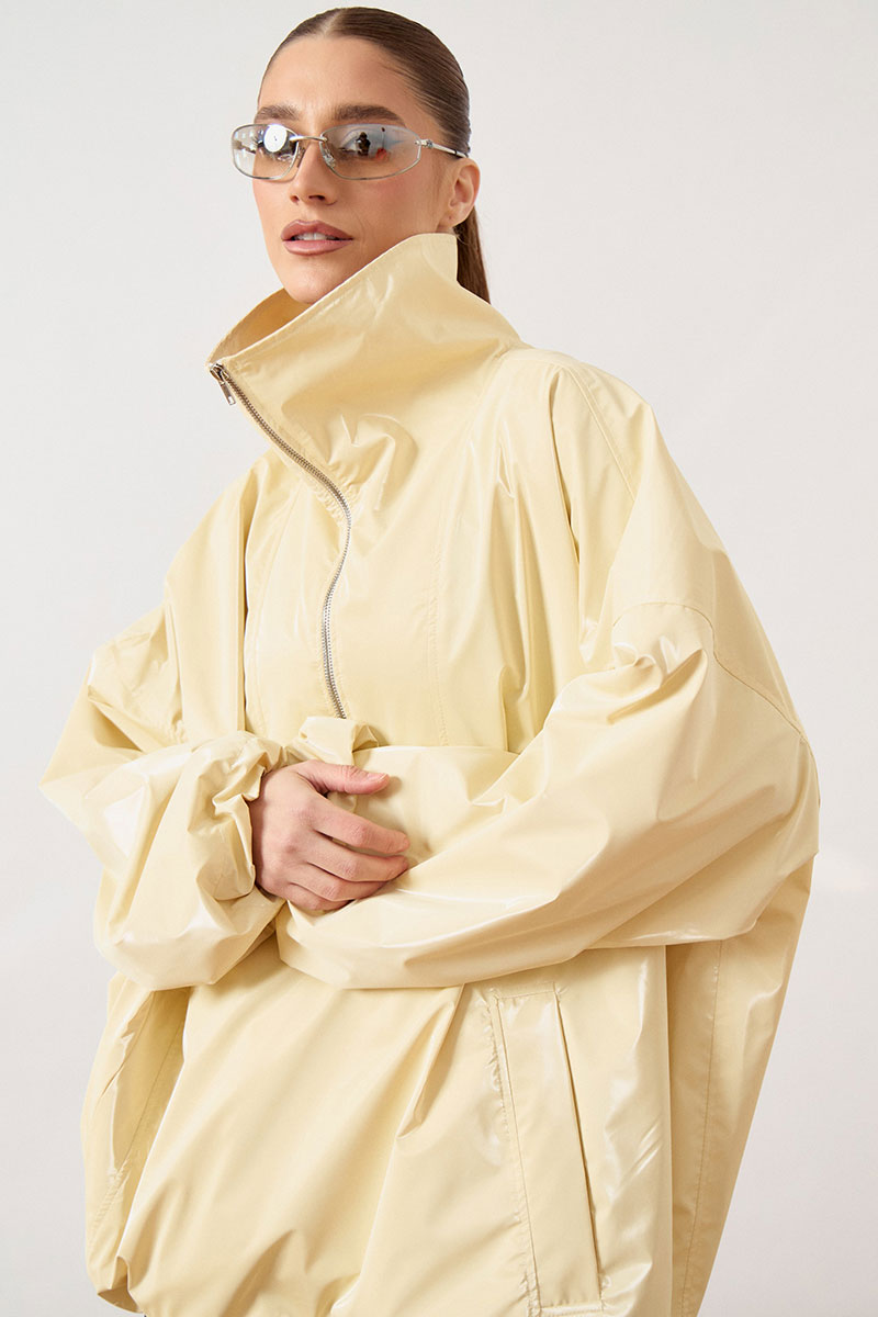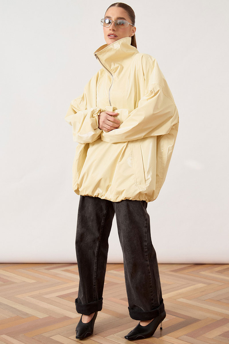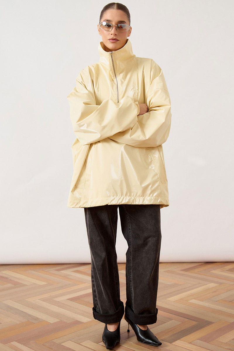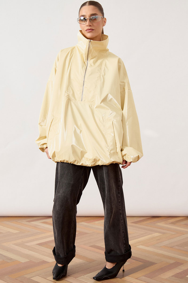 Анорак женский, свободного силуэта, из плотной плащевой ткани. Изделие со спущенной линией плеча и воротником-стойкой. Перед с отрезной кокеткой и центральной застежкой на молнию до середины груди. В нижней части переда расположен накладной карман «кенгуру» с наклонным входом. Спинка цельнокроеная, удлиненная относительно переда. Рукав широкий, одношовный, втачной, по низу собран на эластичную тесьму (резинку). Низ изделия свободный, с небольшим расширением к низу.