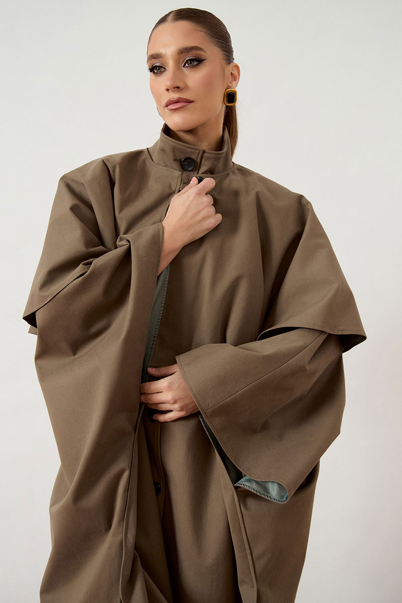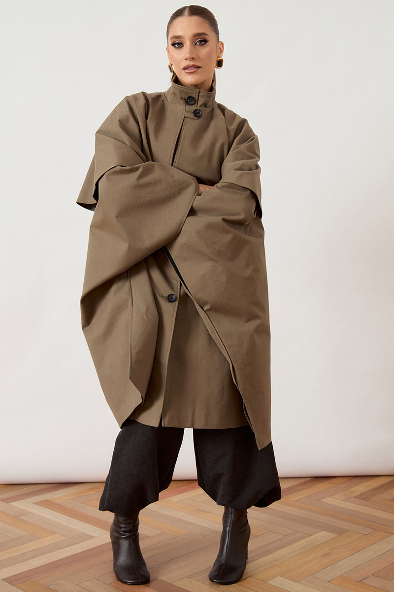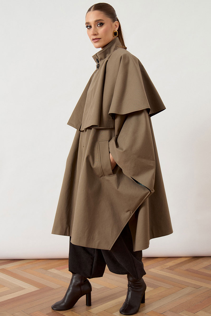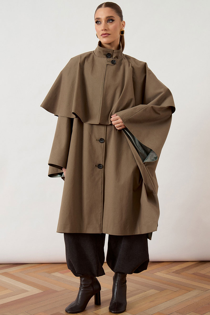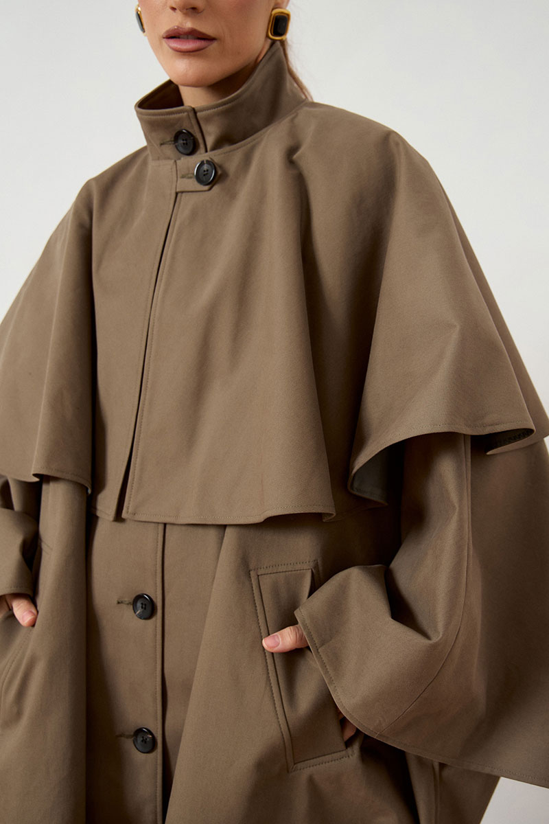 Тренч женский, свободного силуэта, из костюмно-плащевой ткани. Модель с воротником-стойкой и застежкой на петли и пуговицы. Изделие дополнено объемной отлетной кокеткой по переду и спинке, имитирующей кейп. Рукав цельнокроеный, переходящий в широкую форму, с разрезами в нижней части для свободы движения. Перед с вертикальными прорезными карманами в швах. Изделие на подкладке.
