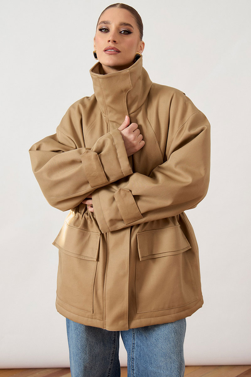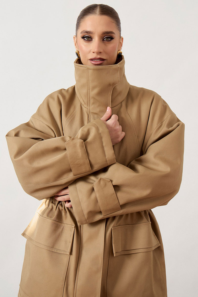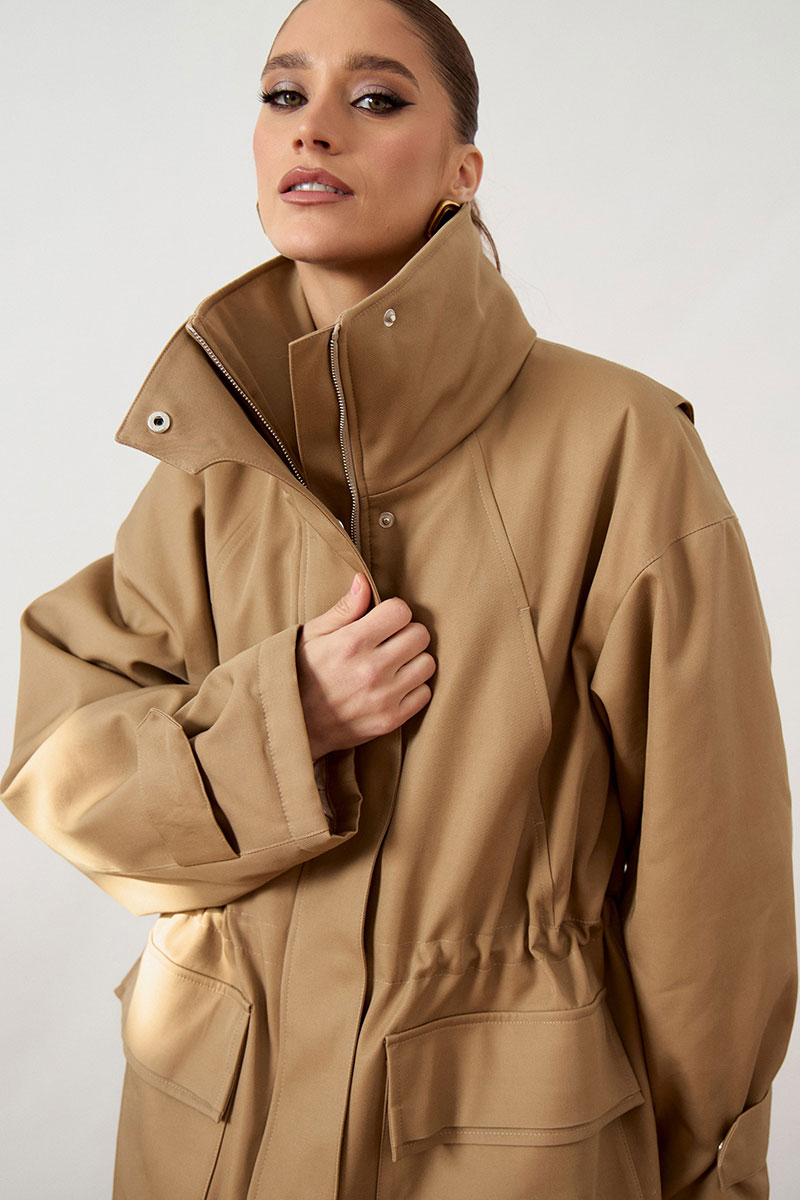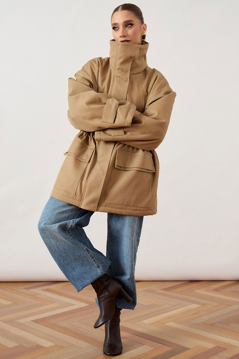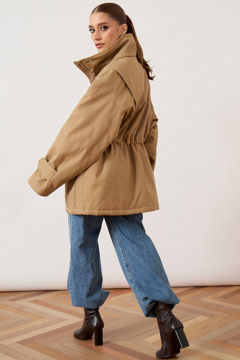 Куртка женская, прямого силуэта, из плотной ткани. Модель с высоким воротником-стойкой и центральной застежкой на молнию, закрытой широкой ветрозащитной планкой. Рукав покроя реглан, свободный, по низу дополнен декоративными патами на кнопках для регулировки объема. В области талии предусмотрена кулиска с эластичным шнуром. На уровне бедер расположены объемные накладные карманы с клапанами. Низ изделия ровный, обработан в подгибку.