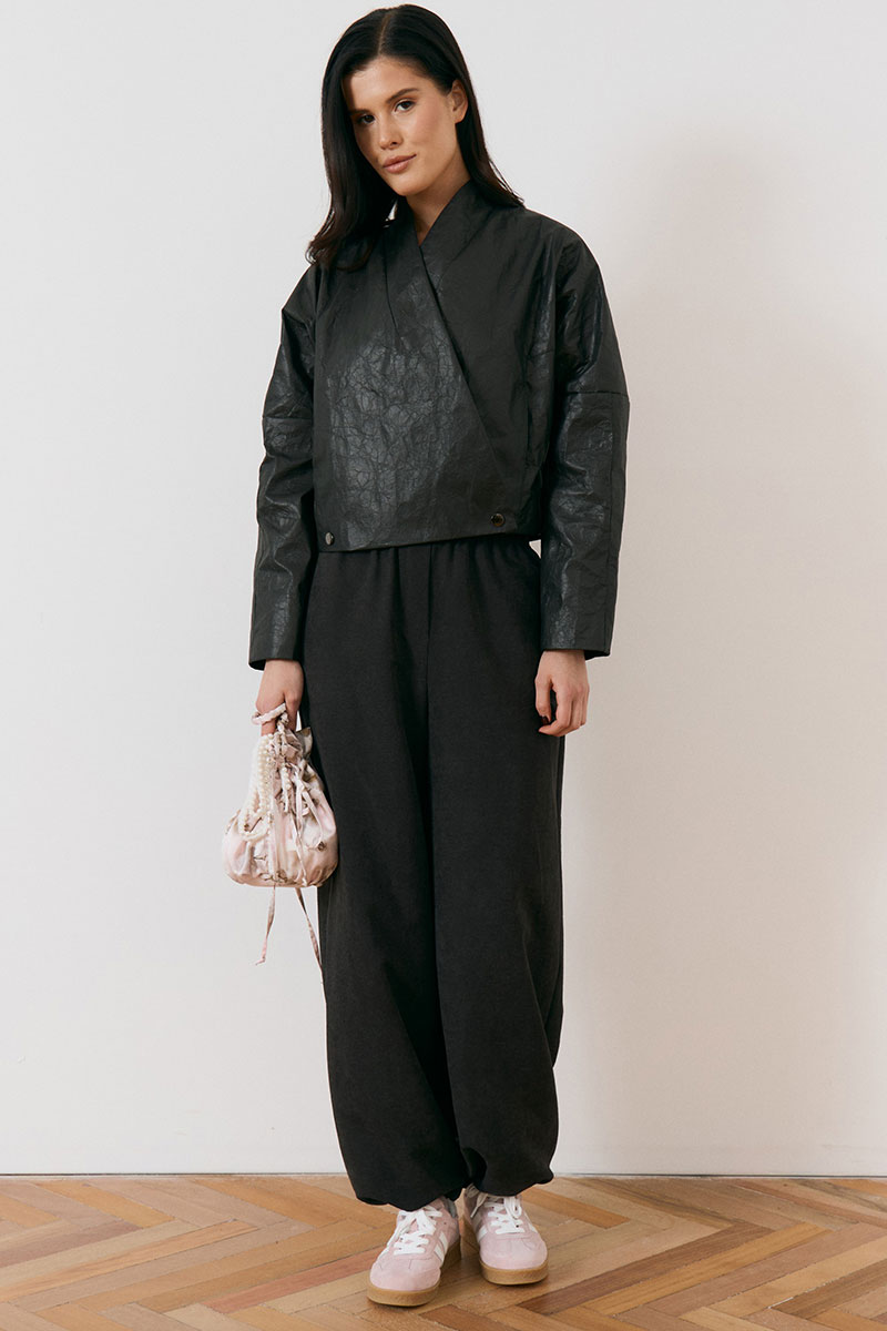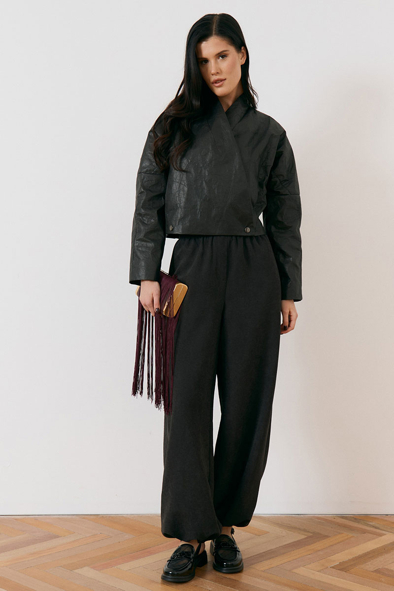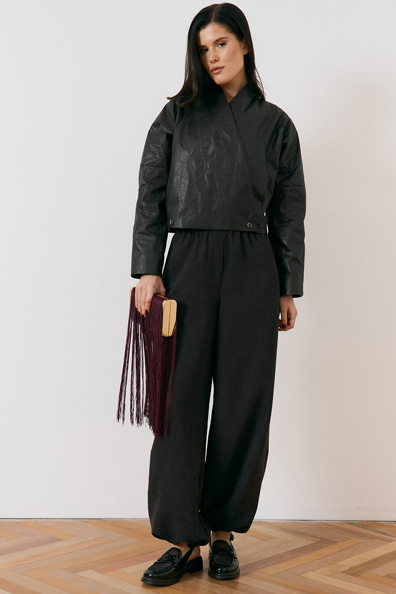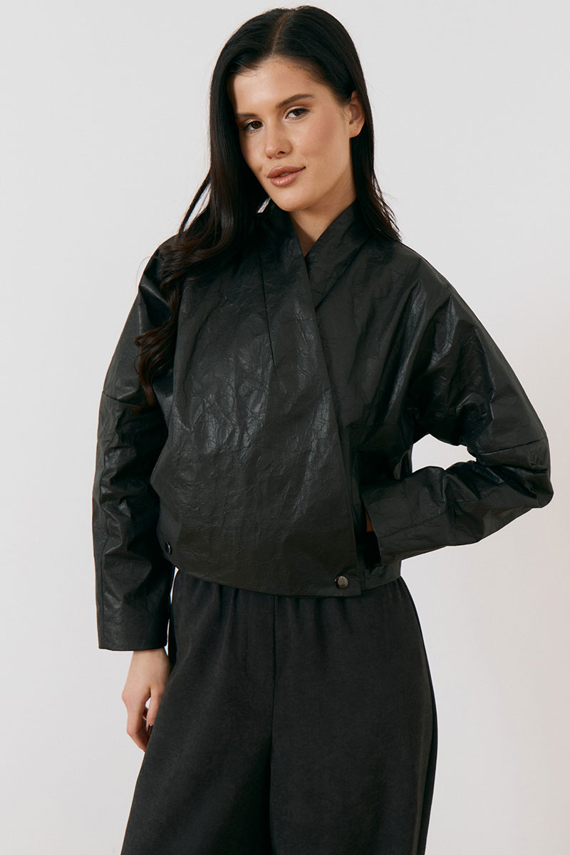 Куртка женская, укороченная, прямого силуэта, из кожи с эффектом «жатки». Модель с воротником-стойкой и глубоким запахом. Застежка асимметричная, на металлические кнопки по нижней планке. Перед и спинка с горизонтальными и вертикальными конструктивными швами. Рукав втачной, широкий, прямого кроя. Линия плеча слегка спущена. Изделие на подкладке, низ обработан вчистую.