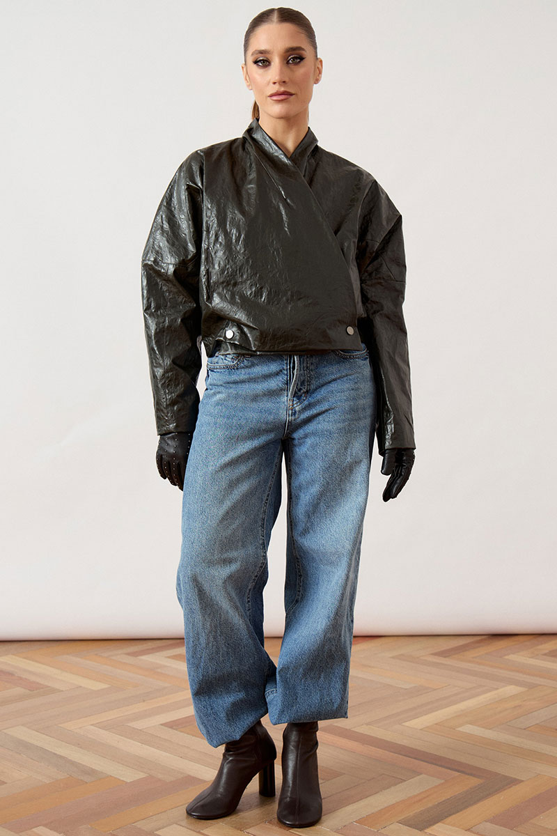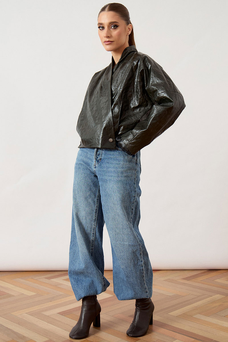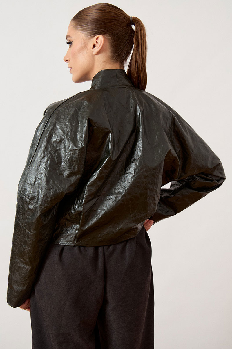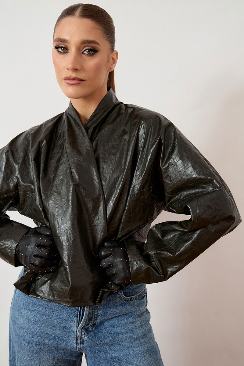 Куртка женская, укороченная, прямого силуэта, из кожи с эффектом «жатки». Модель с воротником-стойкой и глубоким запахом. Застежка асимметричная, на металлические кнопки по нижней планке. Перед и спинка с горизонтальными и вертикальными конструктивными швами. Рукав втачной, широкий, прямого кроя. Линия плеча слегка спущена. Изделие на подкладке, низ обработан вчистую.
