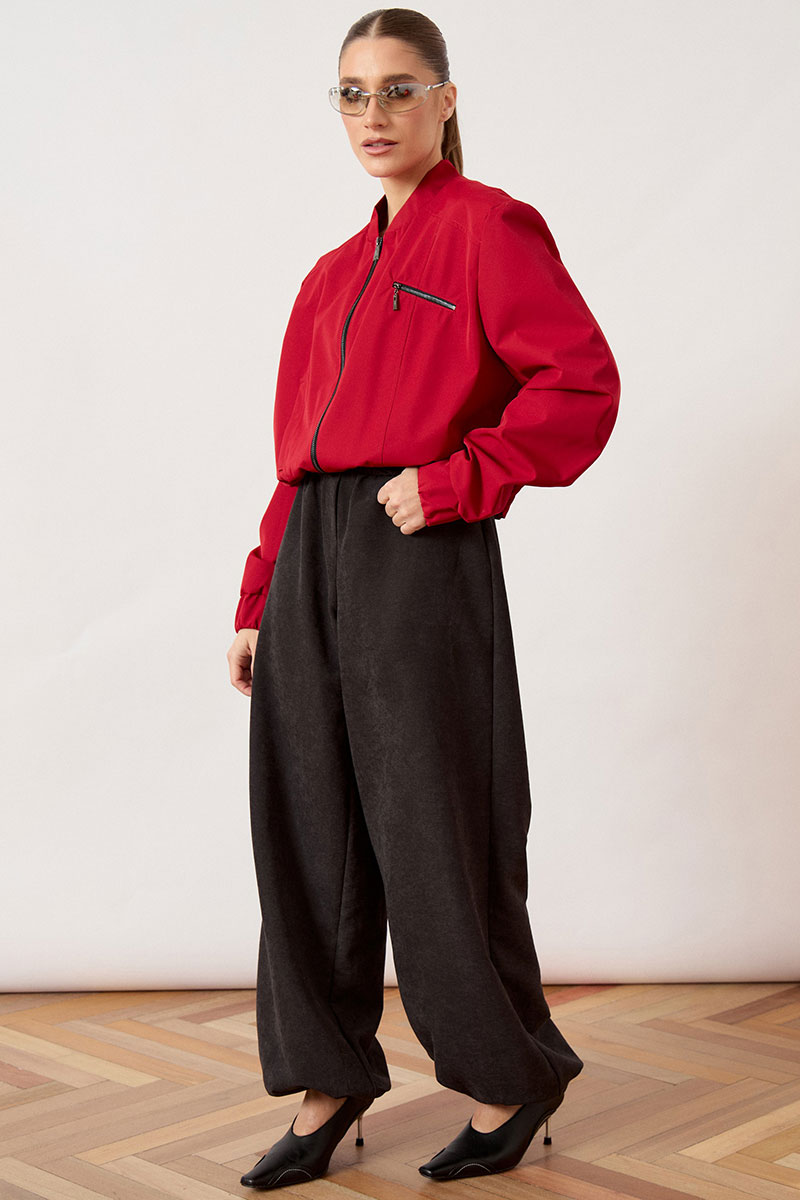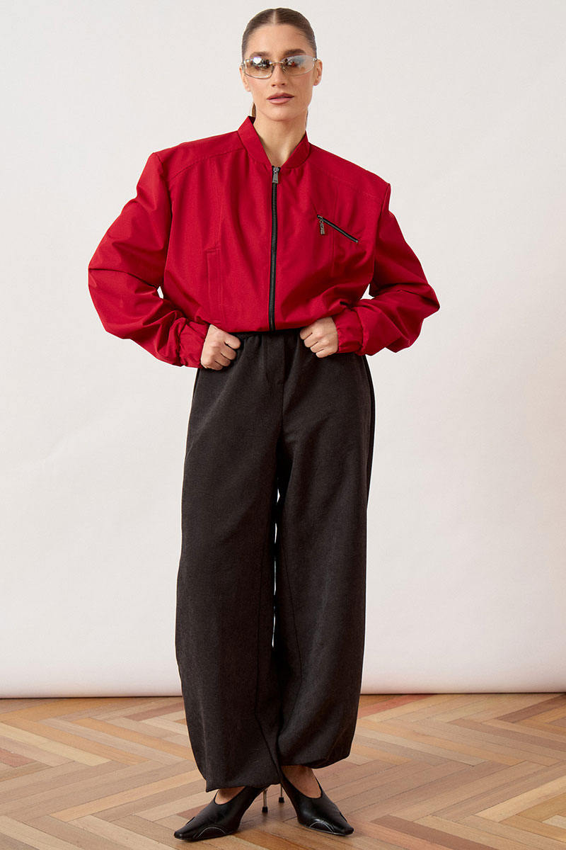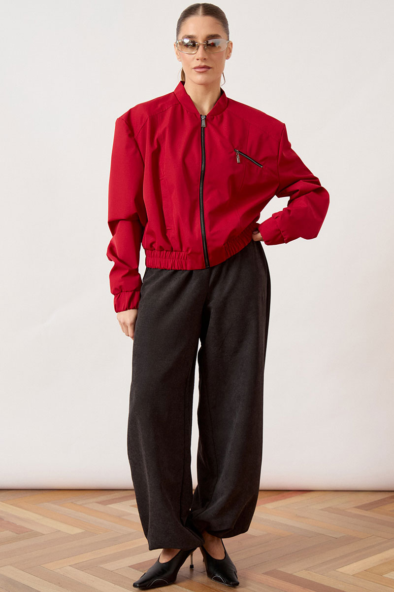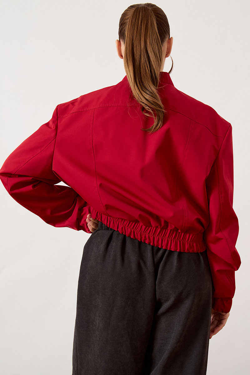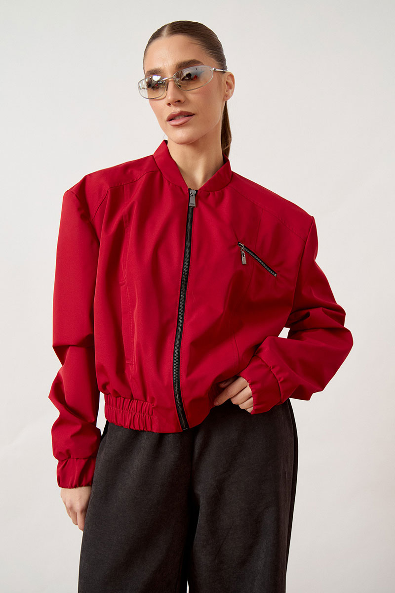 Бомбер женский, укороченный, прямого силуэта из плащевой ткани. Изделие с воротником-стойкой трикотажного типа (довяз) и центральной застежкой на молнию. Полочка с нагрудной вытачкой из плечевого шва. На левой стороне переда расположен декоративный прорезной карман на молнии, расположенный под наклоном. Рукав втачной, по низу оформлен притачной манжетой на резинке. Низ изделия обработан широким притачным поясом с эластичной тесьмой для плотного прилегания.