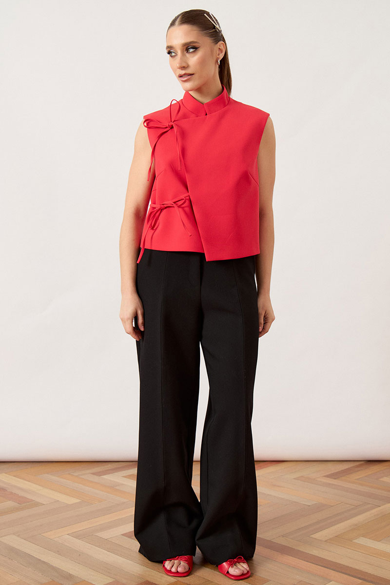 Жилет женский, прямого силуэта, выполнен из плотной костюмной ткани. Модель с воротником-стойкой и глубоким асимметричным запахом на правую сторону. Главной декоративной особенностью изделия являются две пары функциональных завязок из основной ткани, расположенных по правому борту, которые фиксируются на мягкие банты. Перед и спинка с талиевыми вытачками для обеспечения легкого прилегания. Линия плеча укорочена, пройма обработана обтачкой вчистую. Спинка со средним швом. Изделие на подкладке.