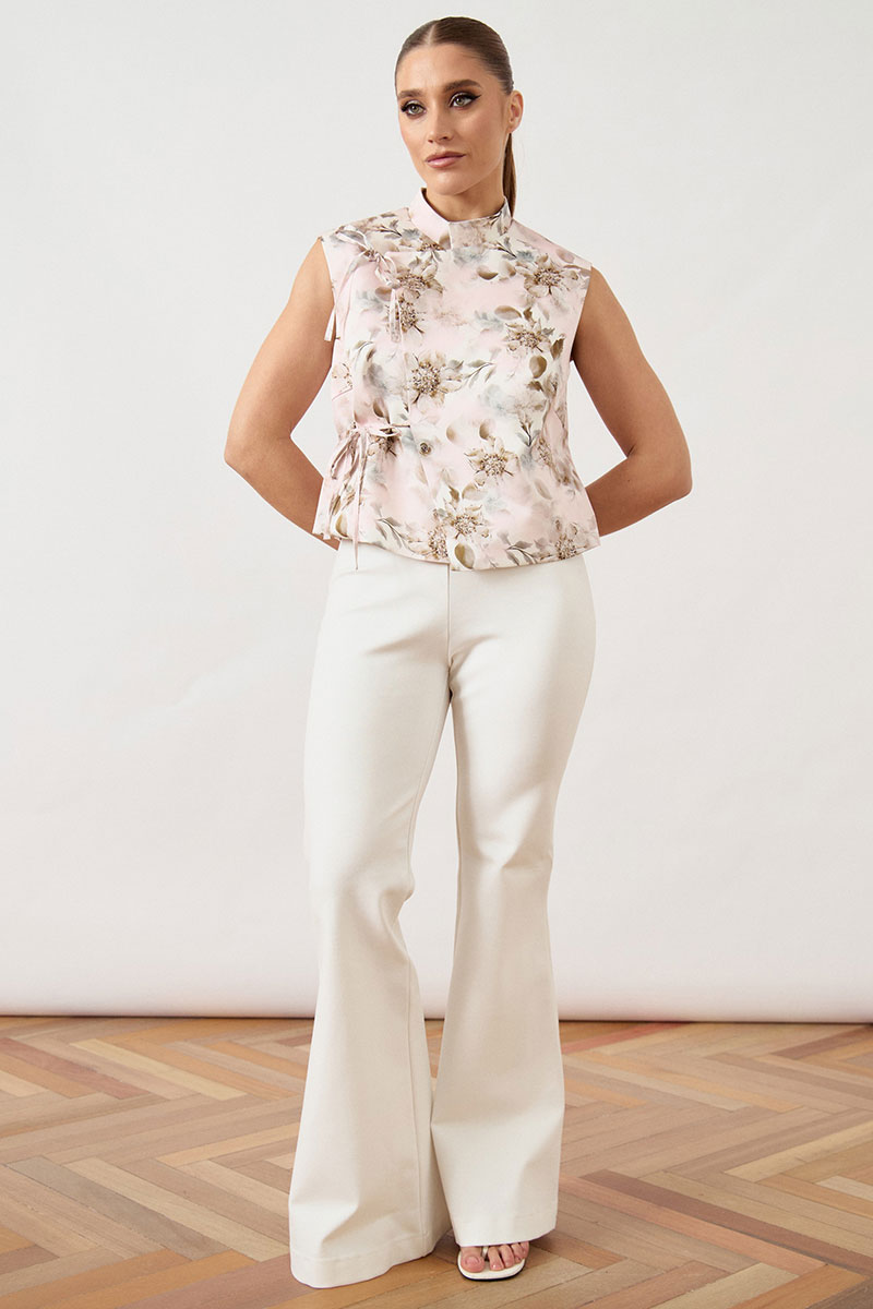 Жилет женский, прилегающего силуэта, выполнен из плотной ткани. Модель с глубоким фигурным вырезом горловины в форме «сердца» (бюстье), без бретелей. Перед и спинка оформлены вертикальными рельефами, в которые вставлены корсетные косточки для создания жесткой формы и подчеркивания талии. Нижний край изделия фигурный, с небольшим удлинением по центру переда. Застежка на потайную тесьму-молнию расположена в среднем шве спинки. Изделие на подкладке, верхний срез обработан обтачкой.