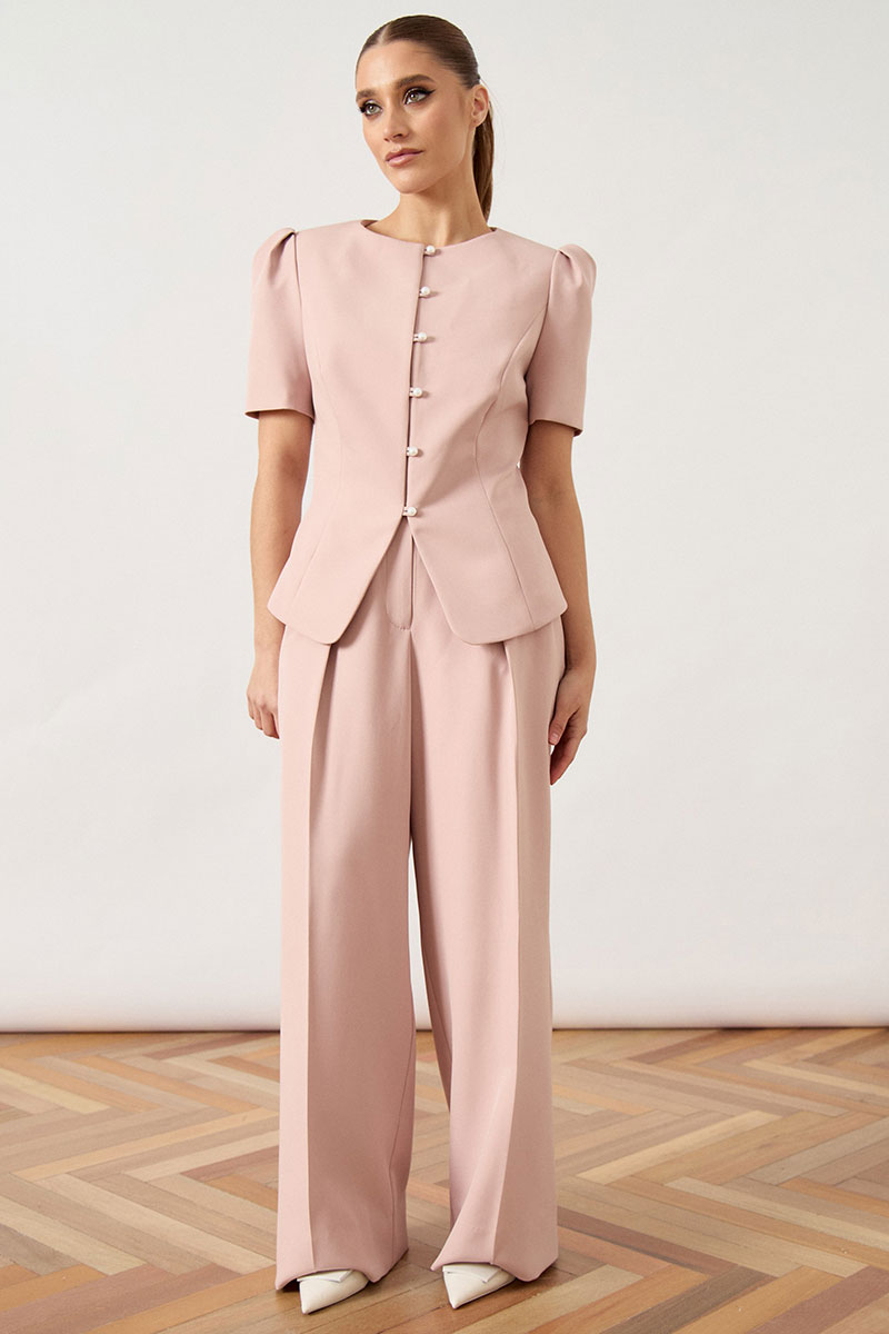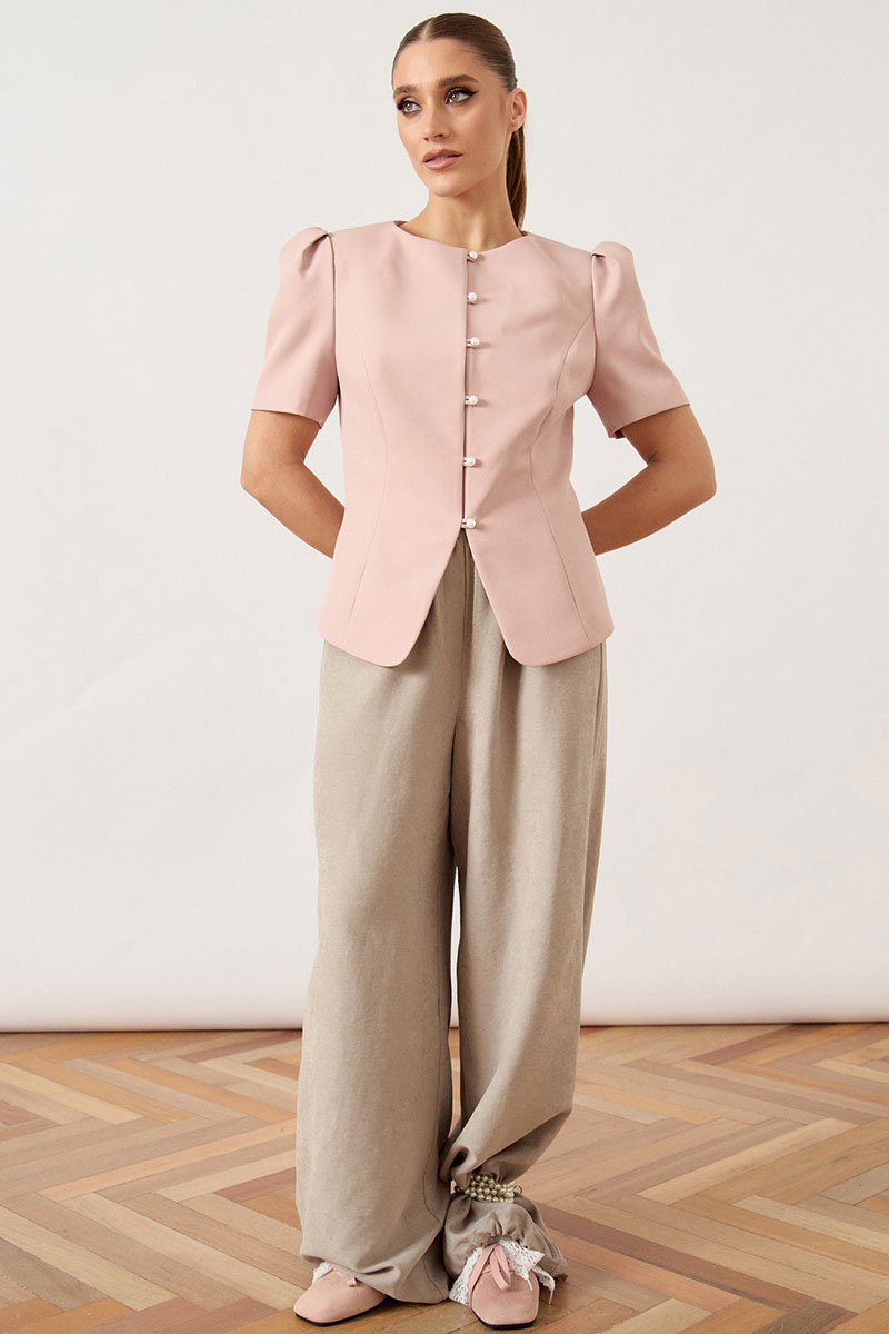 Жакет приталенного силуэта из фактурной костюмной ткани, на притачной подкладке. Горловина круглой формы, без воротника, обработана подбортом. Центральная застежка на пять декоративных пуговиц под жемчуг. Полочка с рельефами, выходящими из проймы. Нижний край жакета с фигурным вырезом по центру. Рукав втачной, короткий, с объемной сборкой по окату («фонарик»).