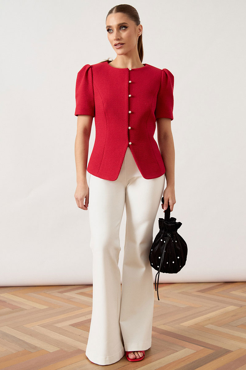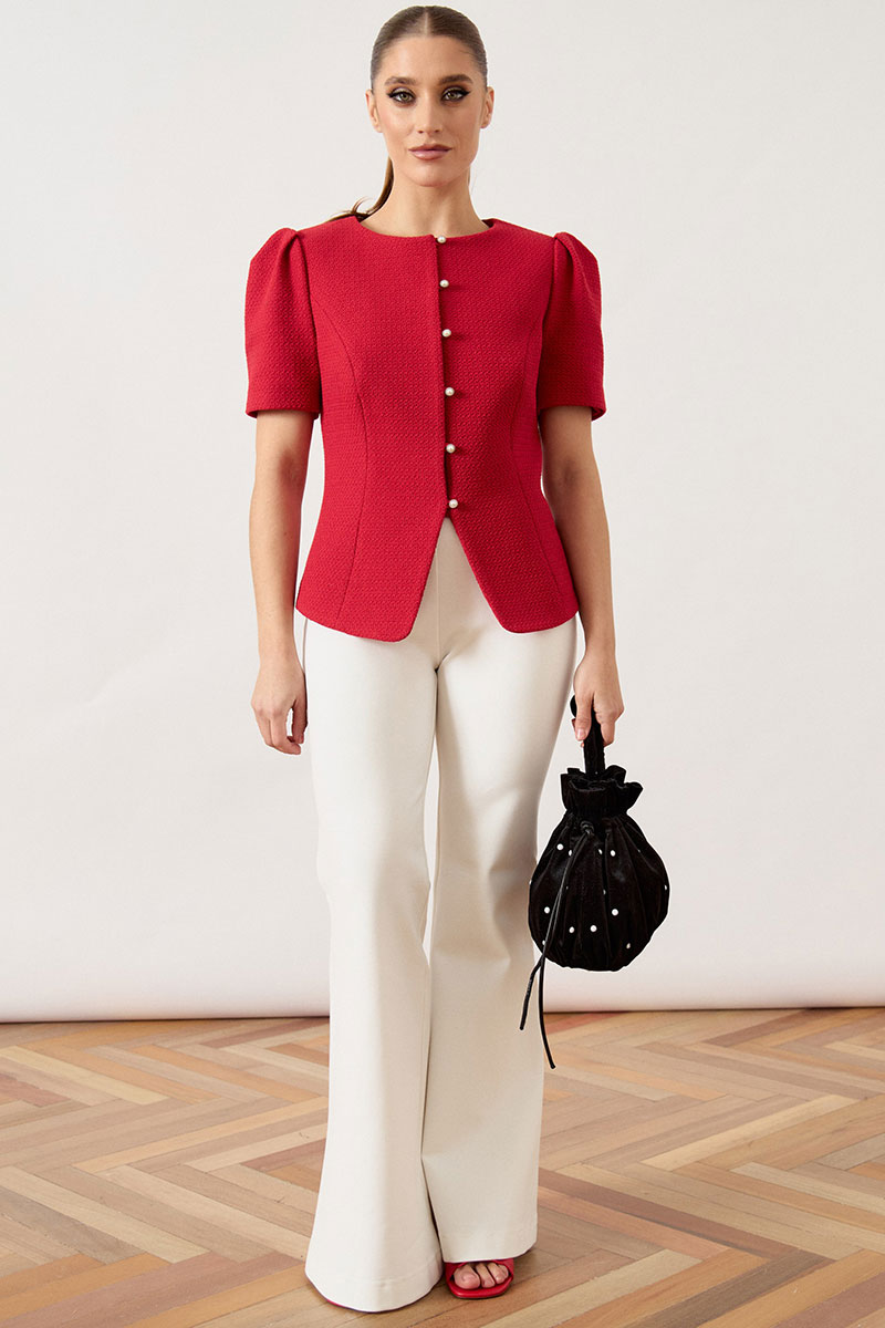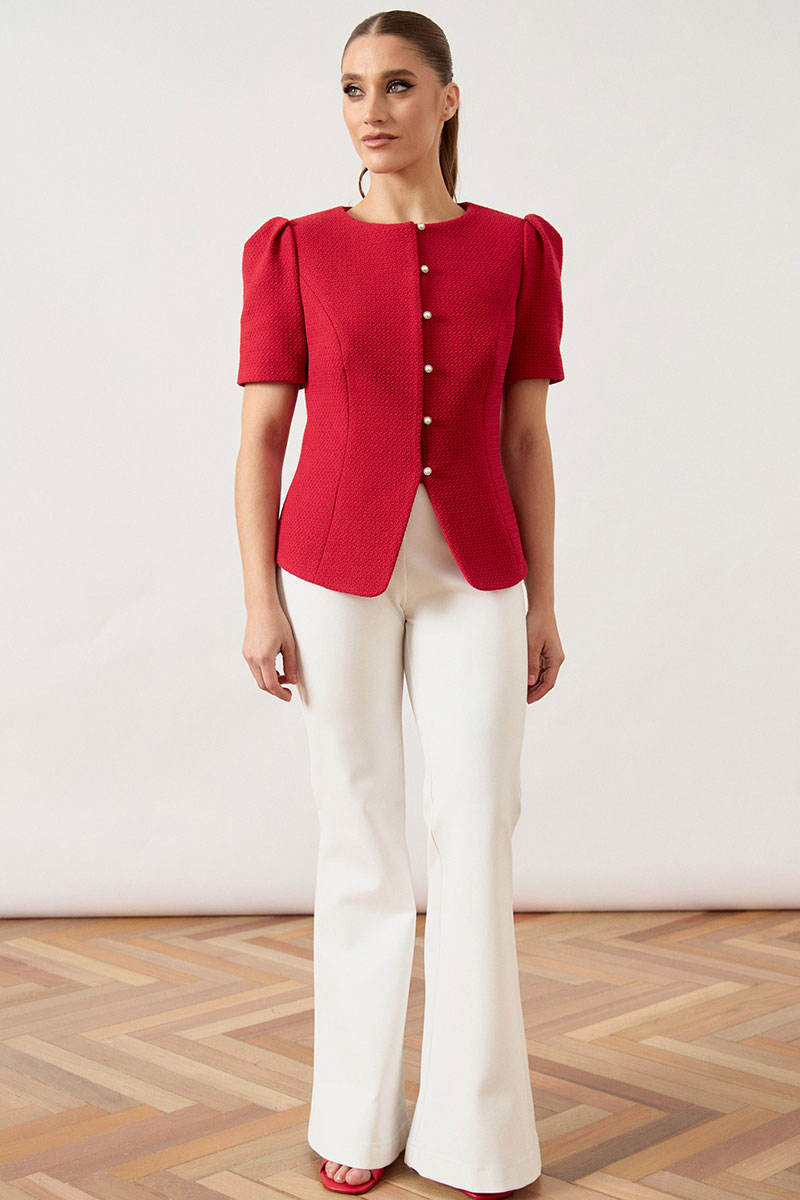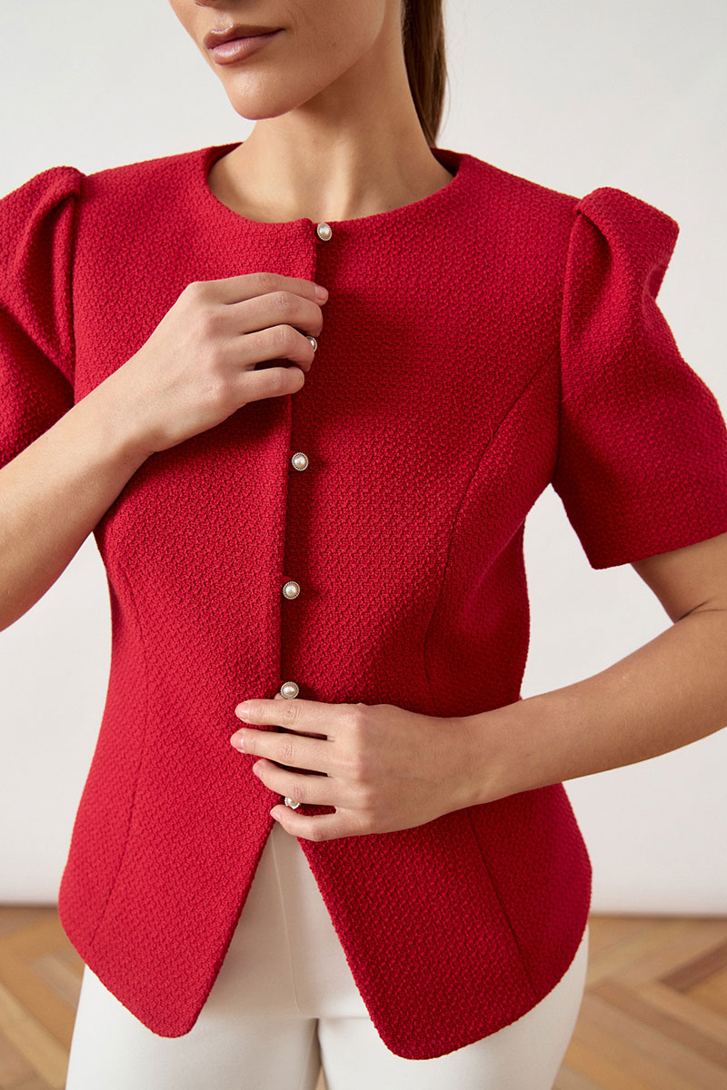 Жакет приталенного силуэта из фактурной костюмной ткани, на притачной подкладке. Горловина круглой формы, без воротника, обработана подбортом. Центральная застежка на пять декоративных пуговиц под жемчуг. Полочка с рельефами, выходящими из проймы. Нижний край жакета с фигурным вырезом по центру. Рукав втачной, короткий, с объемной сборкой по окату («фонарик»).