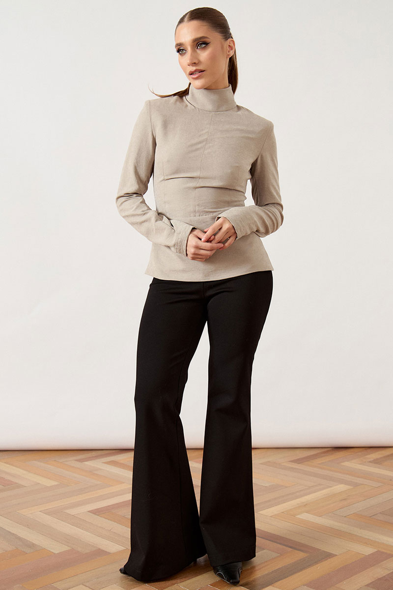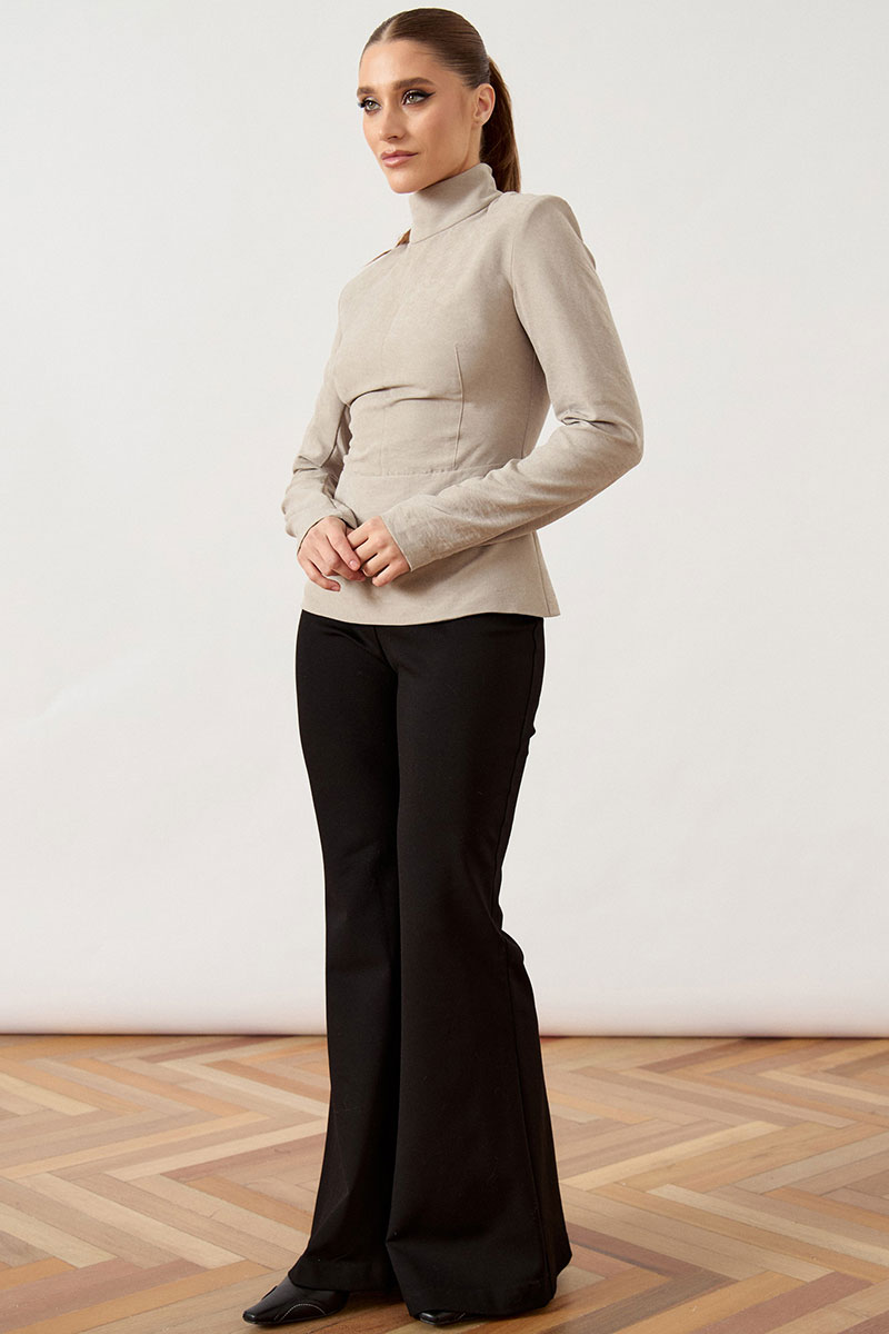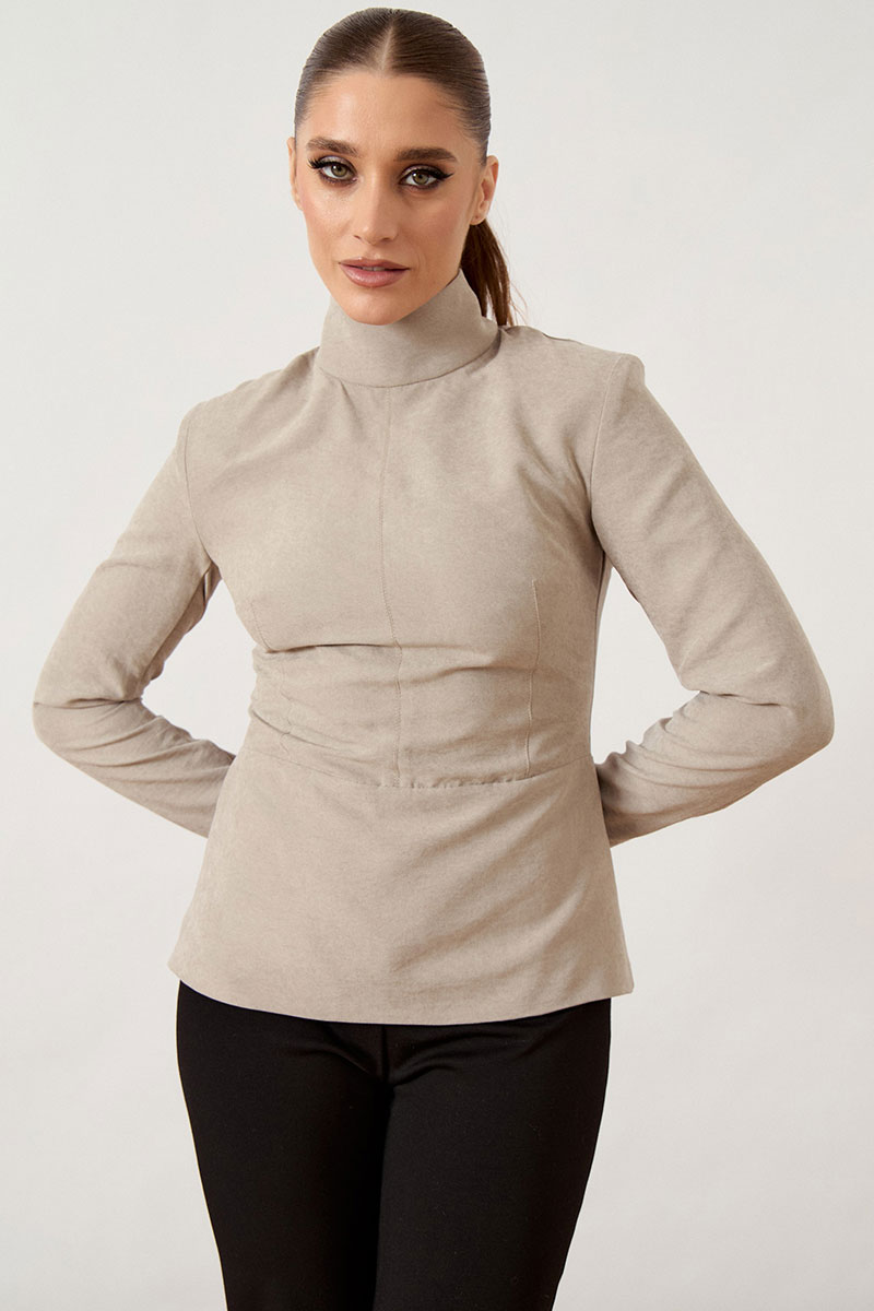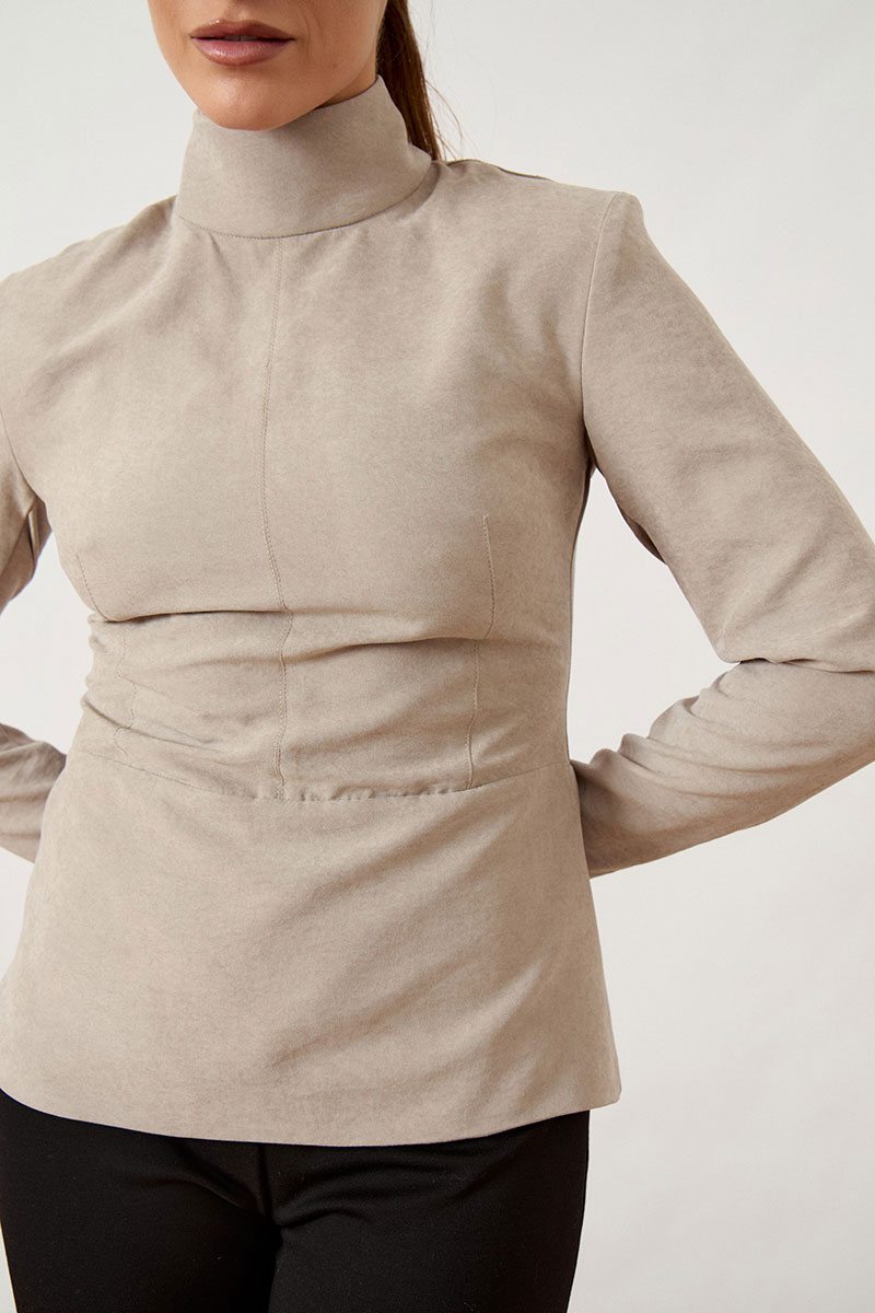 Джемпер прилегающего силуэта выполнен из мягкой костюмно-плательной ткани бежево-песочного оттенка. Модель с воротником-стойкой и длинными втачными рукавами. Передняя часть блузы со сложным конструктивным кроем: горизонтальный подрез по линии талии дополнен вертикальными и нагрудными вытачками, обеспечивающими идеальную посадку по фигуре. Спинка с центральным швом и потайной застежкой-молнией.