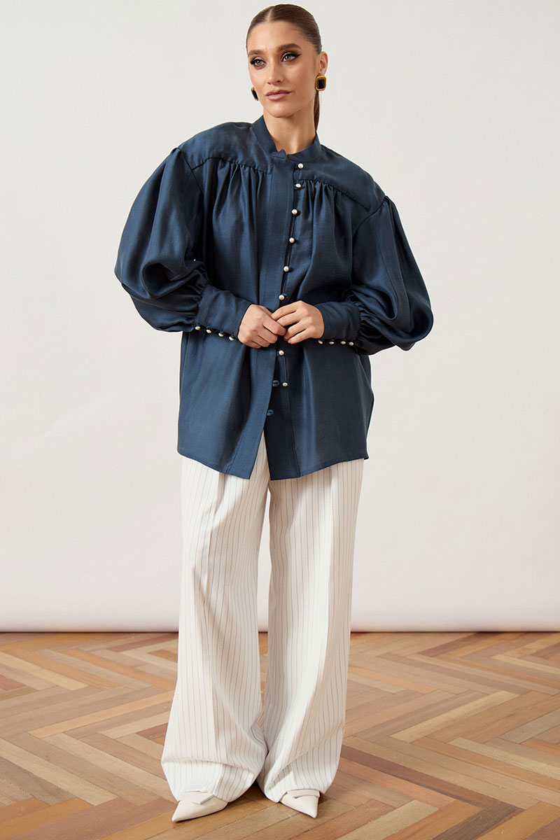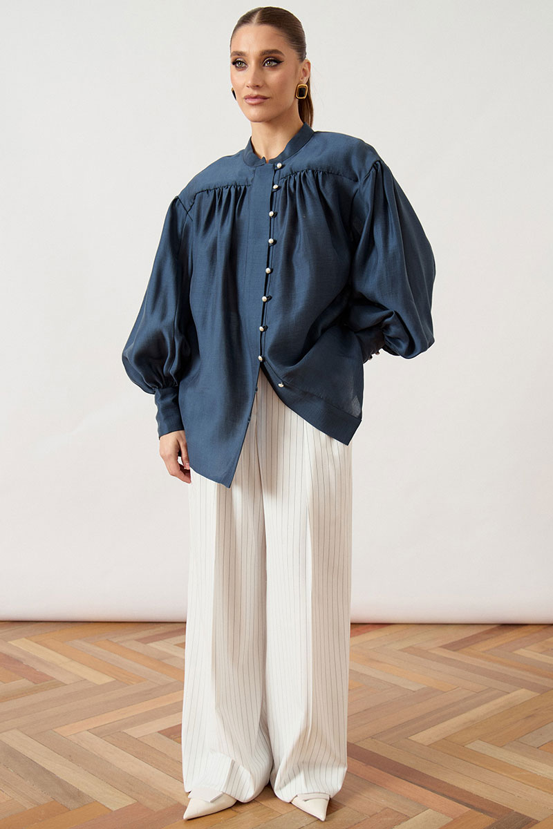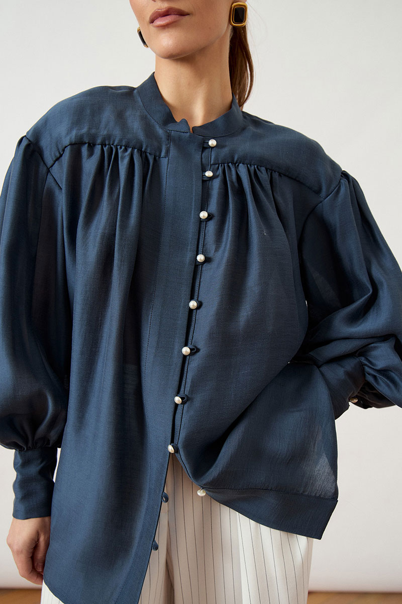 Блуза свободного силуэта (оверсайз) выполнена из струящейся плательной ткани. Модель с воротником-стойкой и центральной застежкой на ряд аккуратных жемчужных пуговиц и навесных петель. Особенностью конструкции является кокетка, переходящая в рукав, и глубокая густая сборка по линии груди и спинки, создающая объемный летящий силуэт. Плечевой пояс спущен, рукав втачной, экстремально объемный, формы «епископ», заканчивающийся высокой притачной манжетой на нескольких пуговицах. Нижний край блузы обработан узким швом вподгиб
