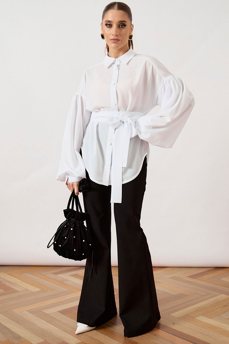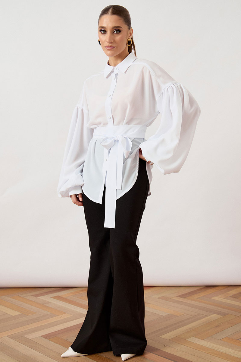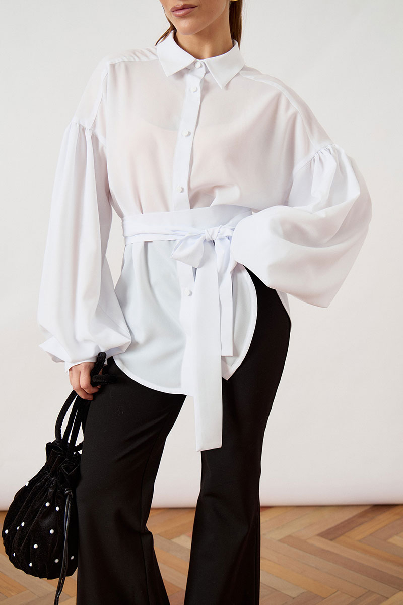 Блуза свободного силуэта (оверсайз) выполнена из легкой плательной ткани классического белого цвета. Модель с отложным воротником на стойке и центральной сквозной застежкой на пуговицы в тон ткани. Главным акцентом изделия являются экстремально объемные втачные рукава со спущенной линией плеча, собранные на густую сборку в нижней части, что создает выразительный эффект «фонарика». Линия талии подчеркнута широким съемным поясом-кушаком из основной ткани, завязывающимся на декоративный бант. Нижний край блузы имеет фигурный срез с закруглениями к боковым швам.
