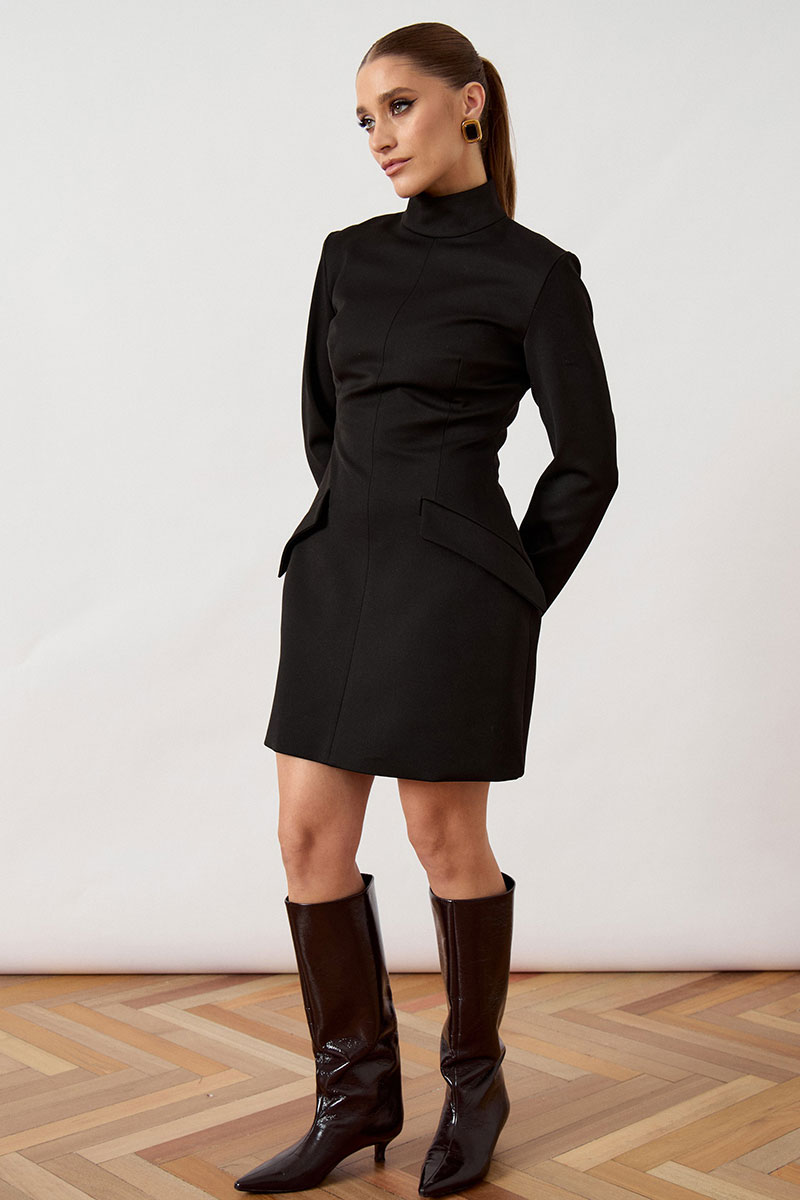 Платье женское приталенного силуэта длины мини, выполнено из плотной костюмной ткани черного цвета. Изделие с воротником-стойкой и длинным втачным рукавом. Переднее полотнище платья с вертикальным средним швом и талиевыми вытачками, обеспечивающими плотное прилегание по фигуре. На уровне бедер расположены декоративные клапаны, имитирующие прорезные карманы. Спинка с талиевыми вытачками и застежкой на потайную молнию в среднем шве. Нижний край изделия обработан подгибкой, линия низа ровная.