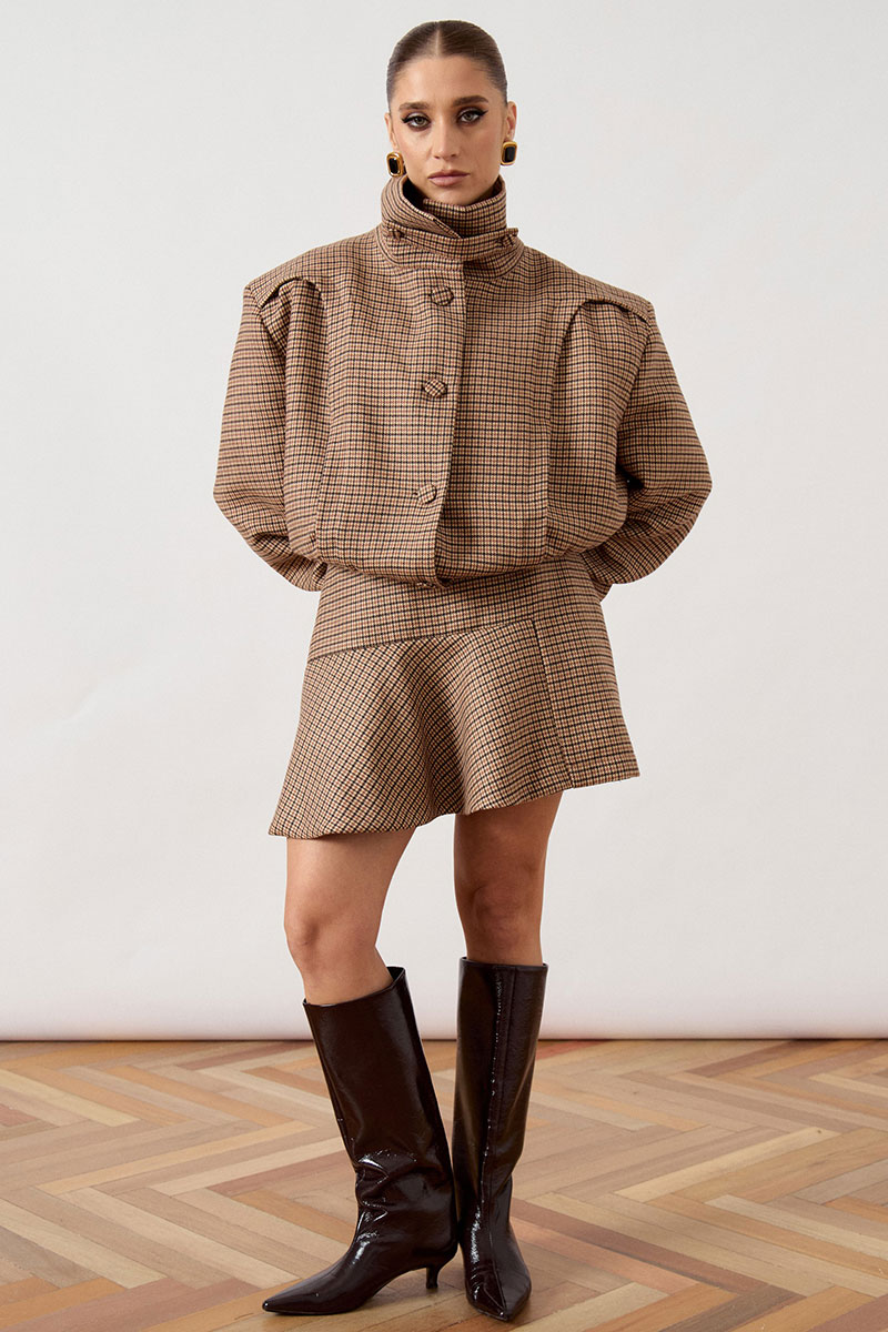 Юбка короткая, расширенная к низу, со вставками, выкроенными по косой, что создает динамичный силуэт. Посадка юбки на талии естественная, пояс притачной.