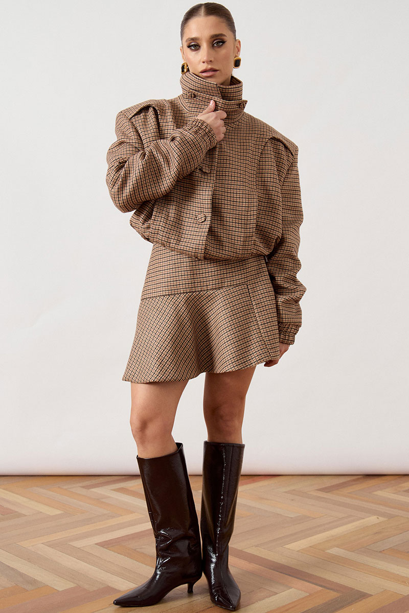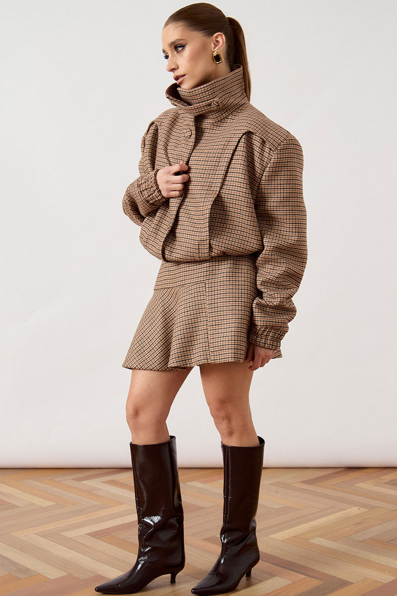 Комплект женский двухпредметный в стиле спорт-шик, состоящий из куртки-бомбера и юбки, выполнен из костюмной ткани.