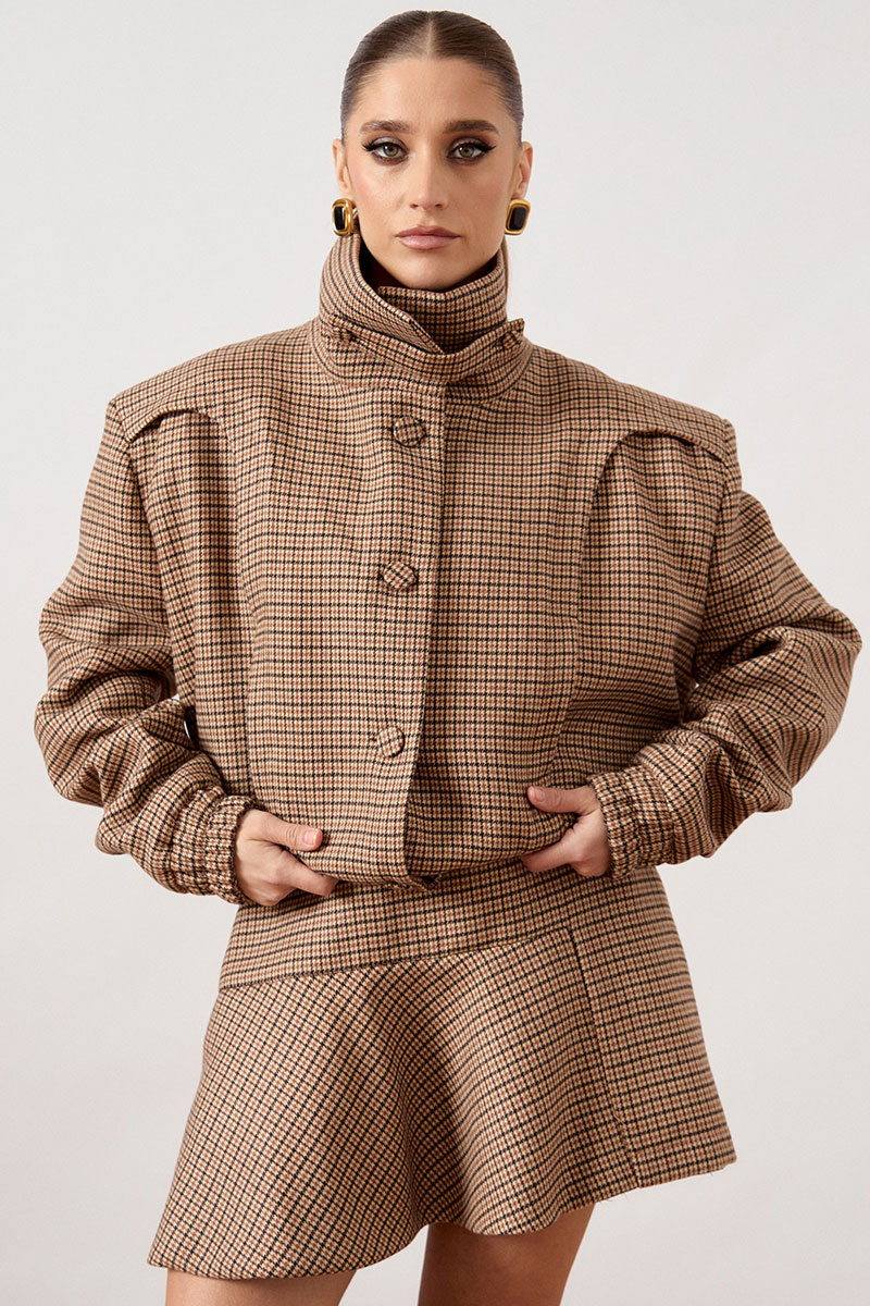 Куртка свободного силуэта с высоким воротником-стойкой на пуговицах и центральной бортовой застежкой на петли и крупные пуговицы в тон ткани. Особенностью модели являются акцентные плечевые накладки и объемные рукава, низ которых оформлен широкой эластичной резинкой. По нижнему краю куртки также предусмотрена эластичная вставка, создающая напуск.