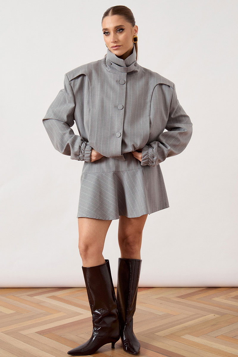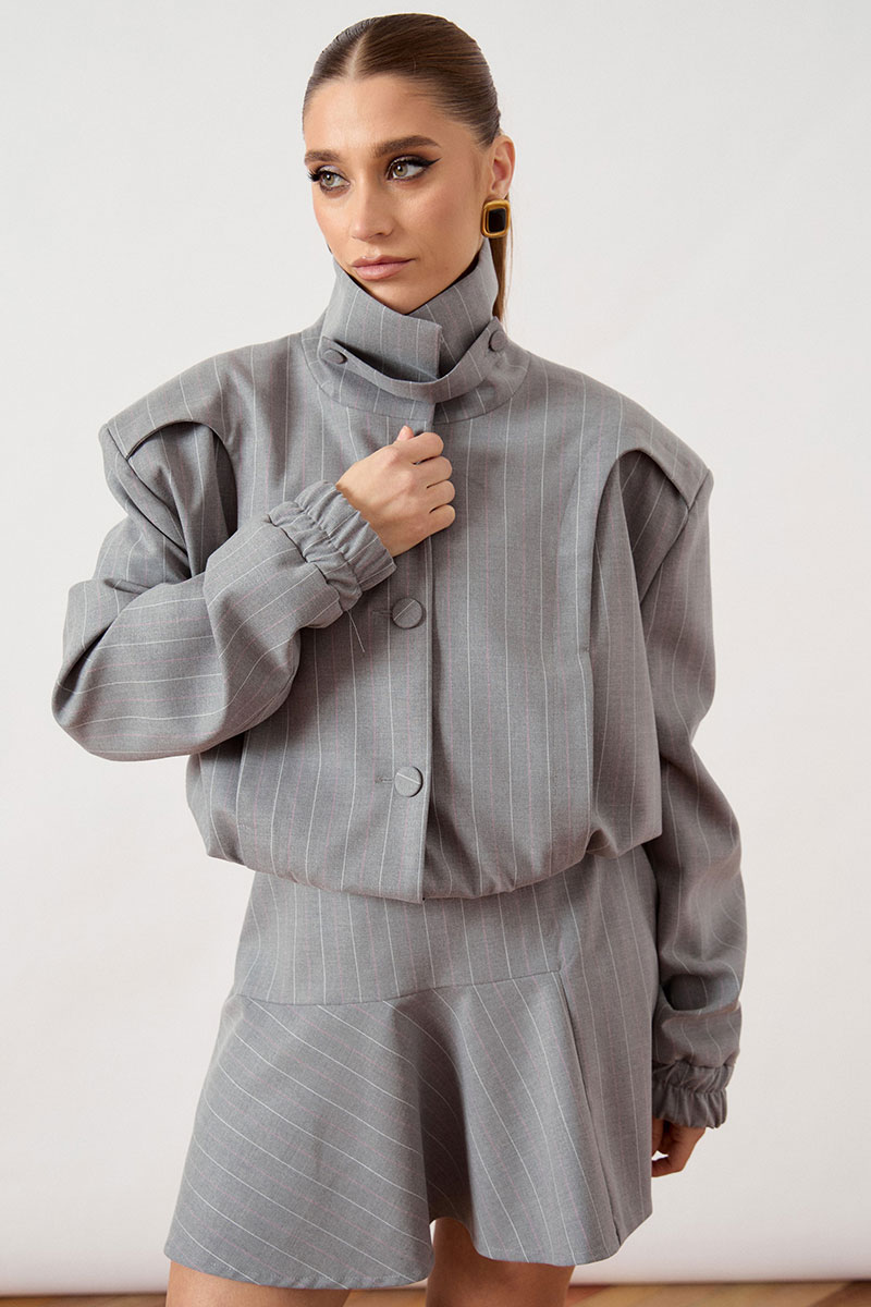 Куртка свободного силуэта с высоким воротником-стойкой на пуговицах и центральной бортовой застежкой на петли и крупные пуговицы в тон ткани. Особенностью модели являются акцентные плечевые накладки и объемные рукава, низ которых оформлен широкой эластичной резинкой. По нижнему краю куртки также предусмотрена эластичная вставка, создающая напуск.