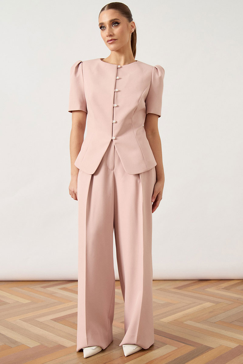 Брюки женские из костюмной ткани, расширенные от бедра, свободного силуэта. Модель с высокой посадкой на притачном поясе со шлевками. Передние половинки с глубокими складками-защипами, переходящими в заутюженные стрелки, и боковыми карманами в швах. Застежка центральная на молнию, скрытую гульфиком, и пуговицу на поясе.