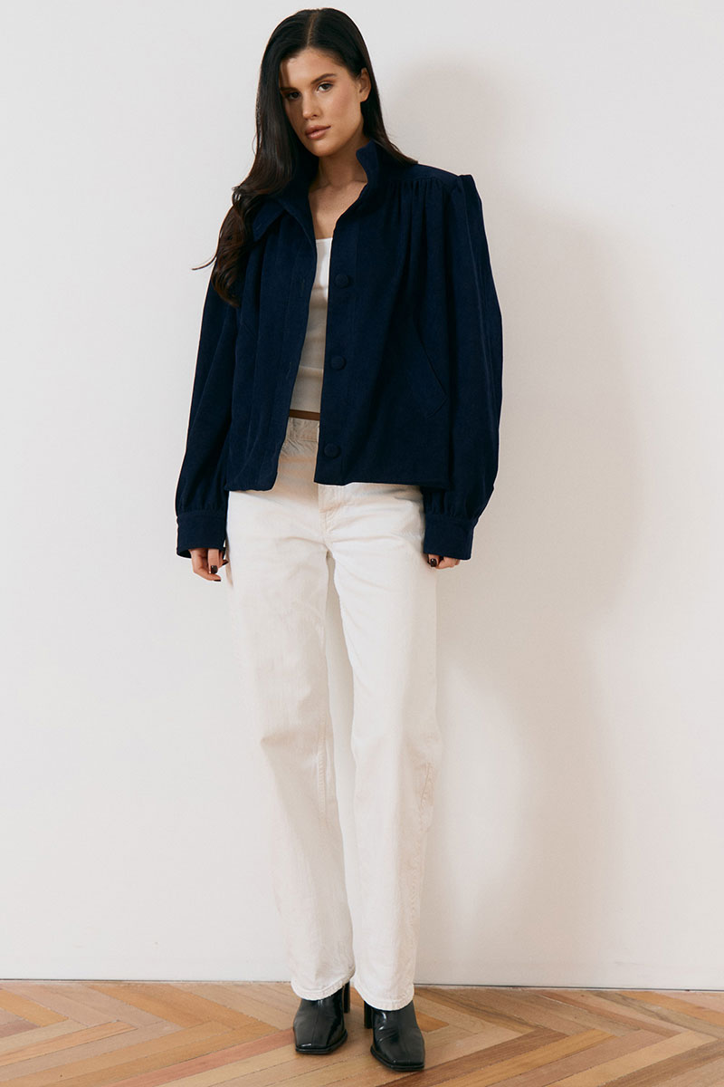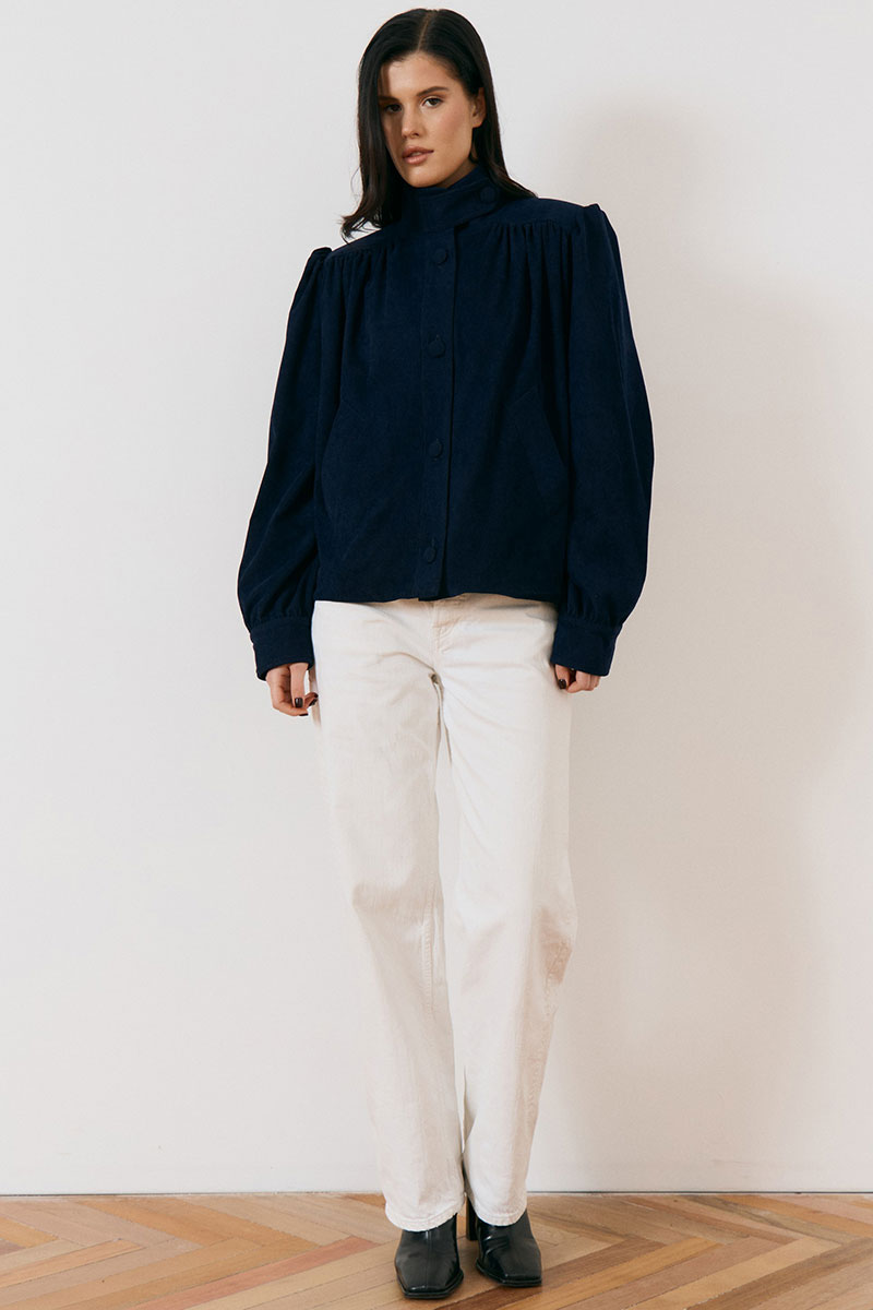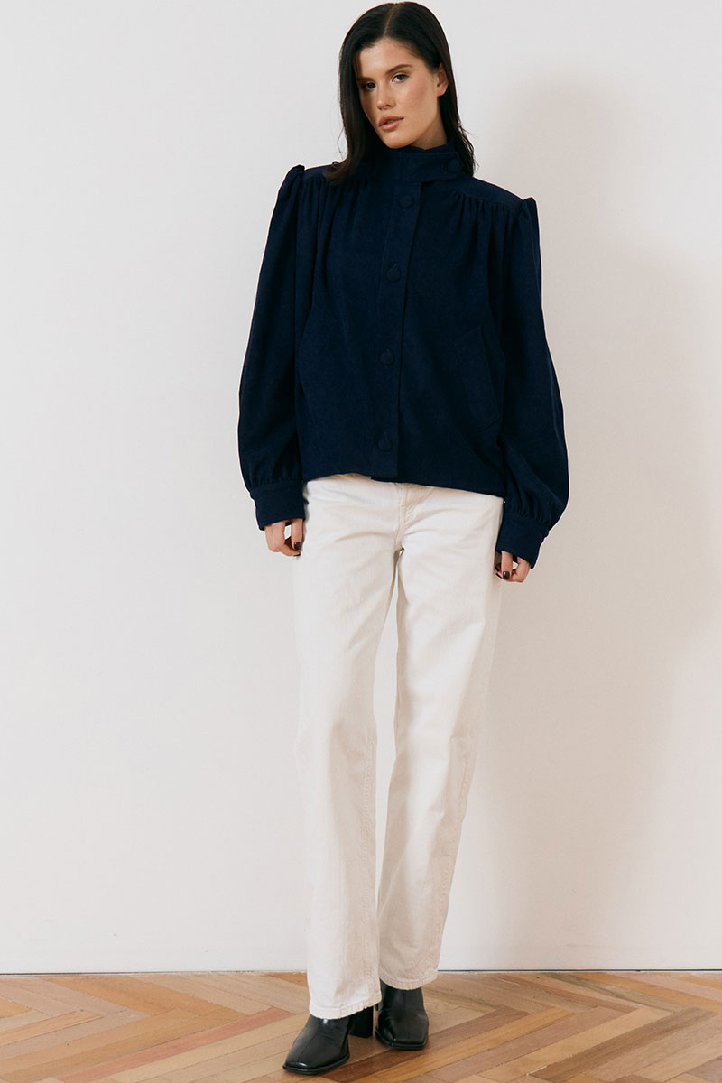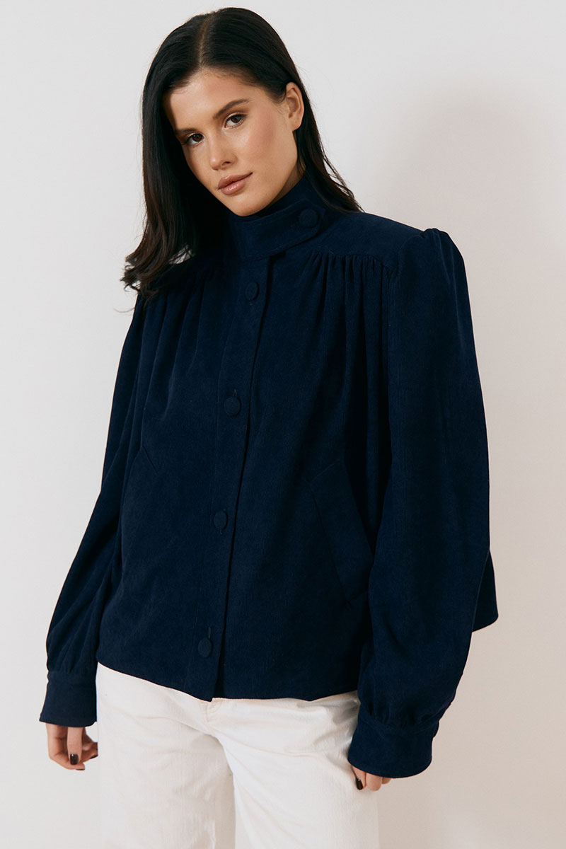 Жакет свободного силуэта с высоким воротником-стойкой на пуговицах и с центральной бортовой застежкой на петли и крупные пуговицы в тон ткани. Особенностью модели являются акцентные плечевые накладки и объемные рукава, по низу рукава манжета.