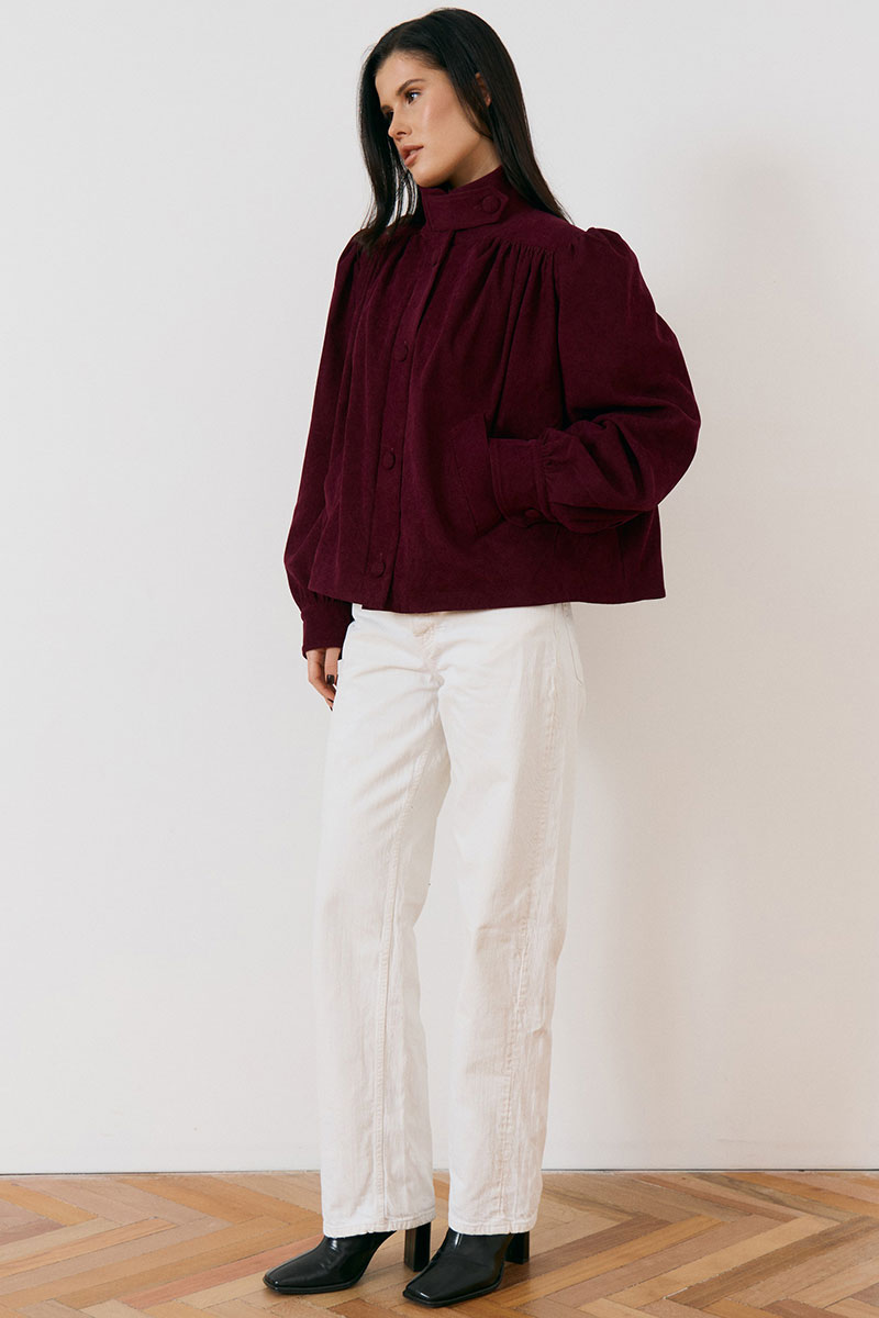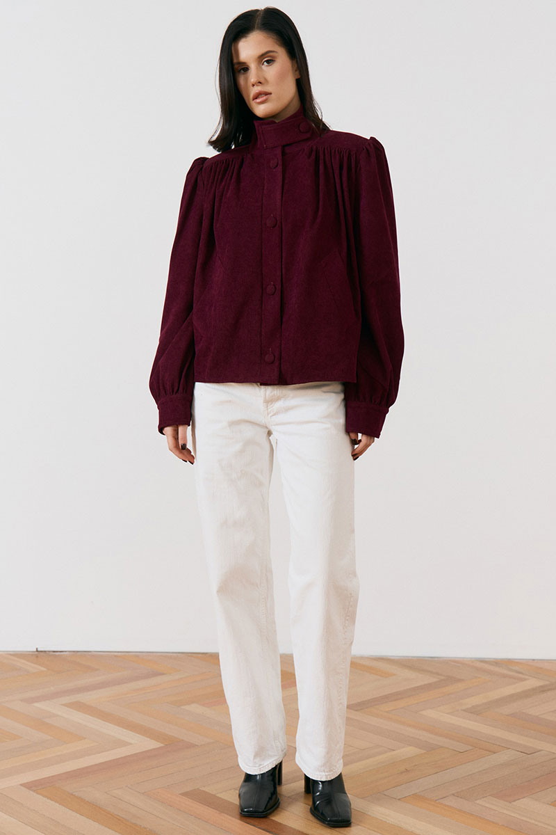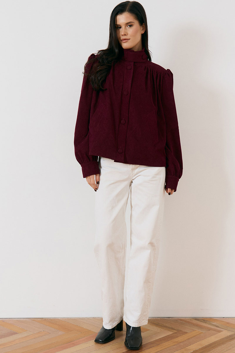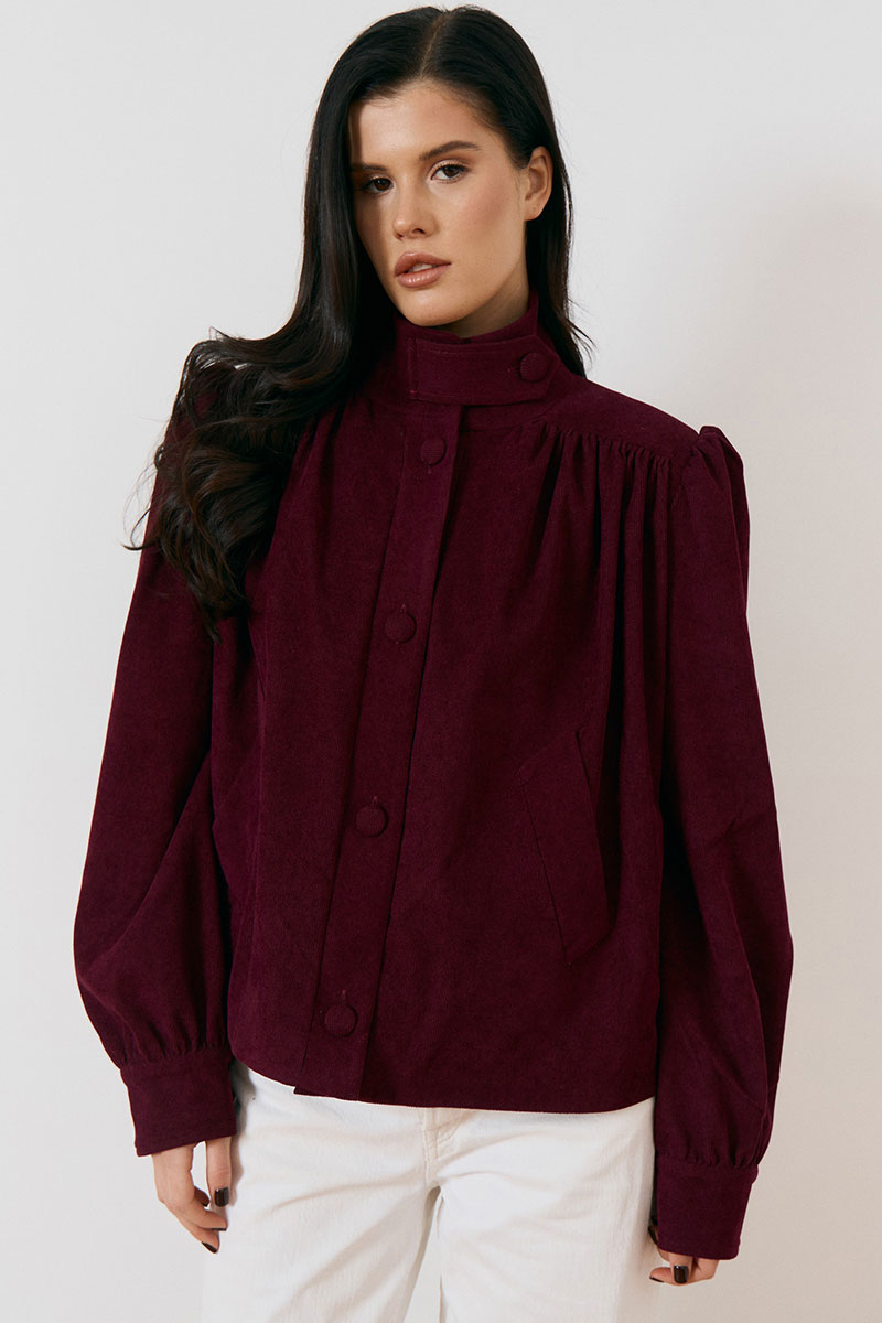 Жакет свободного силуэта с высоким воротником-стойкой на пуговицах и с центральной бортовой застежкой на петли и крупные пуговицы в тон ткани. Особенностью модели являются акцентные плечевые накладки и объемные рукава, по низу рукава манжета.