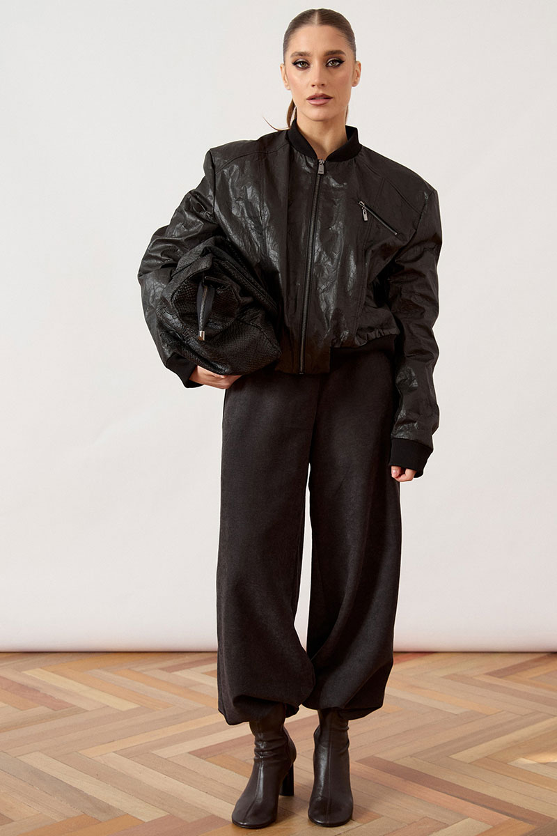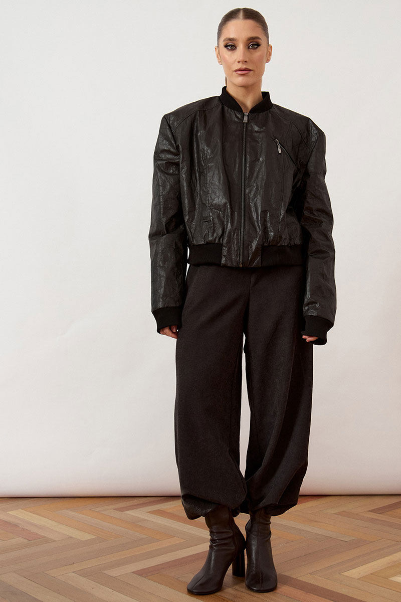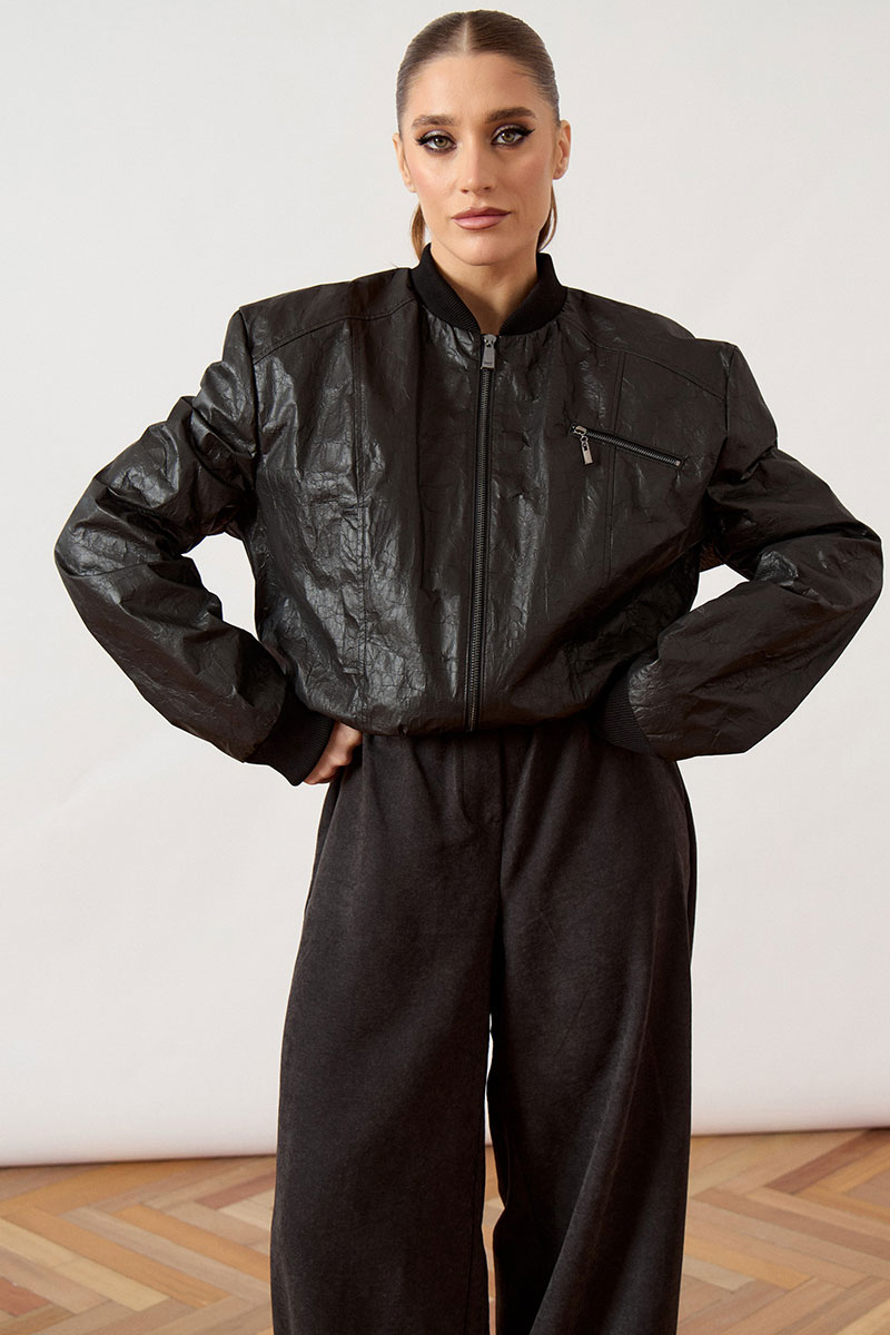 Куртка женская, укороченная, прямого силуэта, из кожи с эффектом «жатки».Модель с воротником стойкой из довяза. Застежка на молнию. По бокам карманы. Рукав втачной, по низу рукава манжеты из довяза. Довяз по низу изделия.