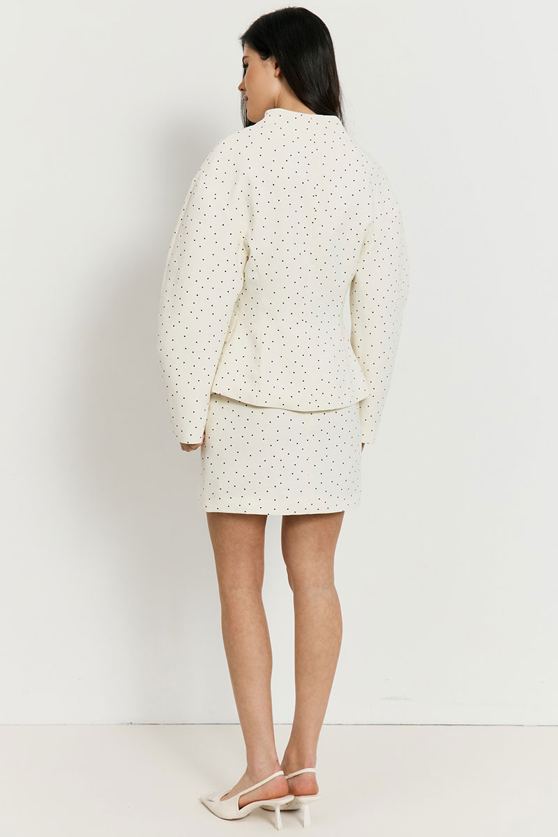 Элегантный костюм-двойка из плотной формоустойчивой ткани с классическим принтом в мелкий горошек. Комплект состоит из приталенного жакета и прямой мини-юбки. Жакет отличается архитектурным кроем с объемными рукавами «баллон» и спущенной линией плеча. Модель имеет минималистичный V-образный вырез без воротника, центральную застежку на контрастные пуговицы и функциональные прорезные карманы с клапанами. Фигурная линия низа жакета со скругленными полочками идеально гармонирует с лаконичным силуэтом мини-юбки, создавая стильный и современный образ.