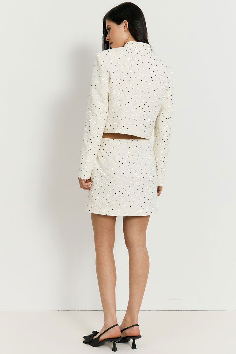Лаконичная юбка-мини А-силуэта, выполненная из плотной костюмной ткани с классическим принтом в мелкий горошек. Модель имеет высокую посадку на талии, обеспечивающую идеальную посадку по фигуре, и чистые линии кроя без лишних деталей. Универсальный фасон и графичный рисунок позволяют легко комбинировать юбку как с укороченными жакетами из комплекта, так и с базовыми джемперами или блузами для создания актуального образа в стиле ретро-модерн.