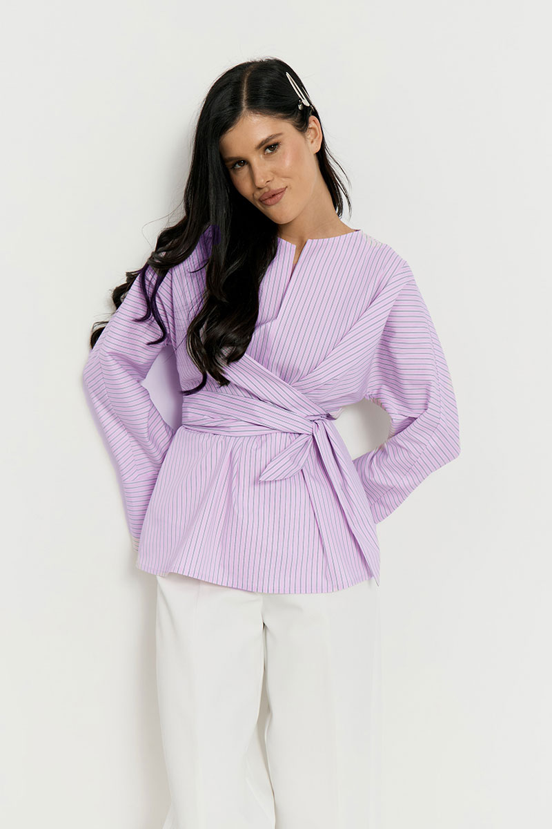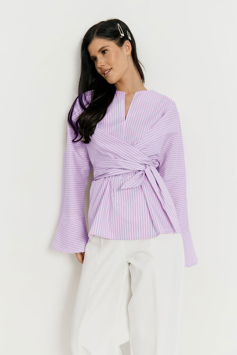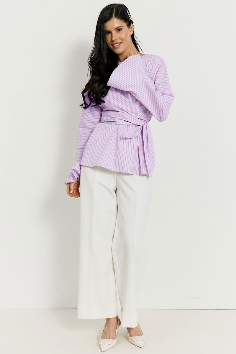 Стильная рубашка приталенного силуэта, выполненная в оригинальном дизайне с эффектом запаха. Главным акцентом модели являются объемные удлиненные рукава с расклешенными манжетами и широкий пояс-лента из основной ткани, который позволяет регулировать прилегание и подчеркивает линию талии. Лаконичный вырез горловины и мягкие драпировки создают современный структурированный образ, идеально подходящий для создания эффектных повседневных и деловых комплектов в сочетании с широкими брюками или юбками.