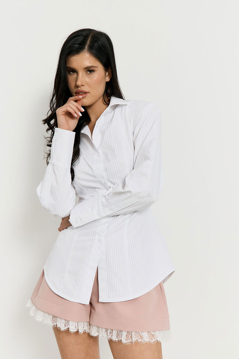 Элегантная рубашка приталенного силуэта в тонкую вертикальную полоску, дополненная глубоким V-образным вырезом и классическим отложным воротником. Модель отличается оригинальной драпировкой в области лифа и акцентными объемными рукавами со спущенной линией плеча и высокими манжетами. Конструктивные рельефные швы и скрытая застежка обеспечивают безупречную посадку, а архитектурный крой в сочетании со строгим принтом делает изделие идеальным выбором для создания современного делового образа с акцентом на женственность.