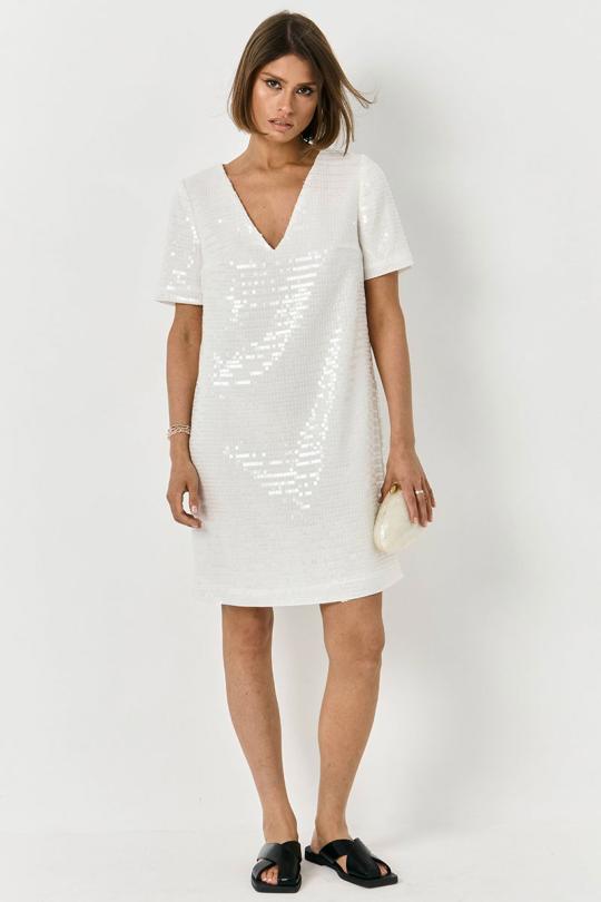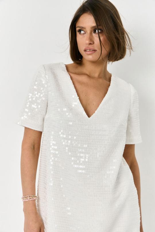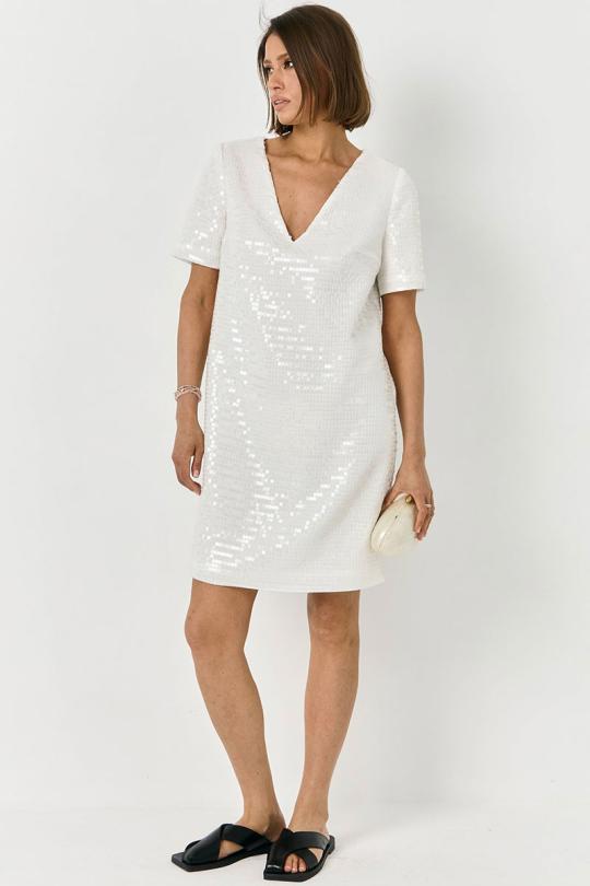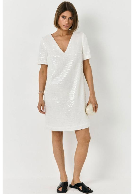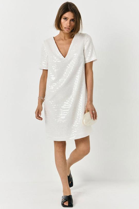 Платье прямого свободного кроя. По переду V-образный вырез. Рукав втачной. Платье выполнено из ткани с пайетками. Платье полностью на хлопковой подкладке. По спинке застежка на небольшую пуговицу. Платье маломерит.