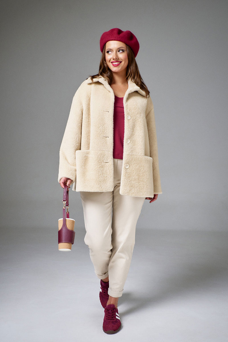 Укороченное пальто из мягкого коротковорсового меха на трикотажной основе, слегка расширенного силуэта, застежкой на пуговицы и отложным воротником со стойкой. Рукав длинный, линия плеча спущена. На переде карманы в горизонтальных швах. Изделие на подкладке.