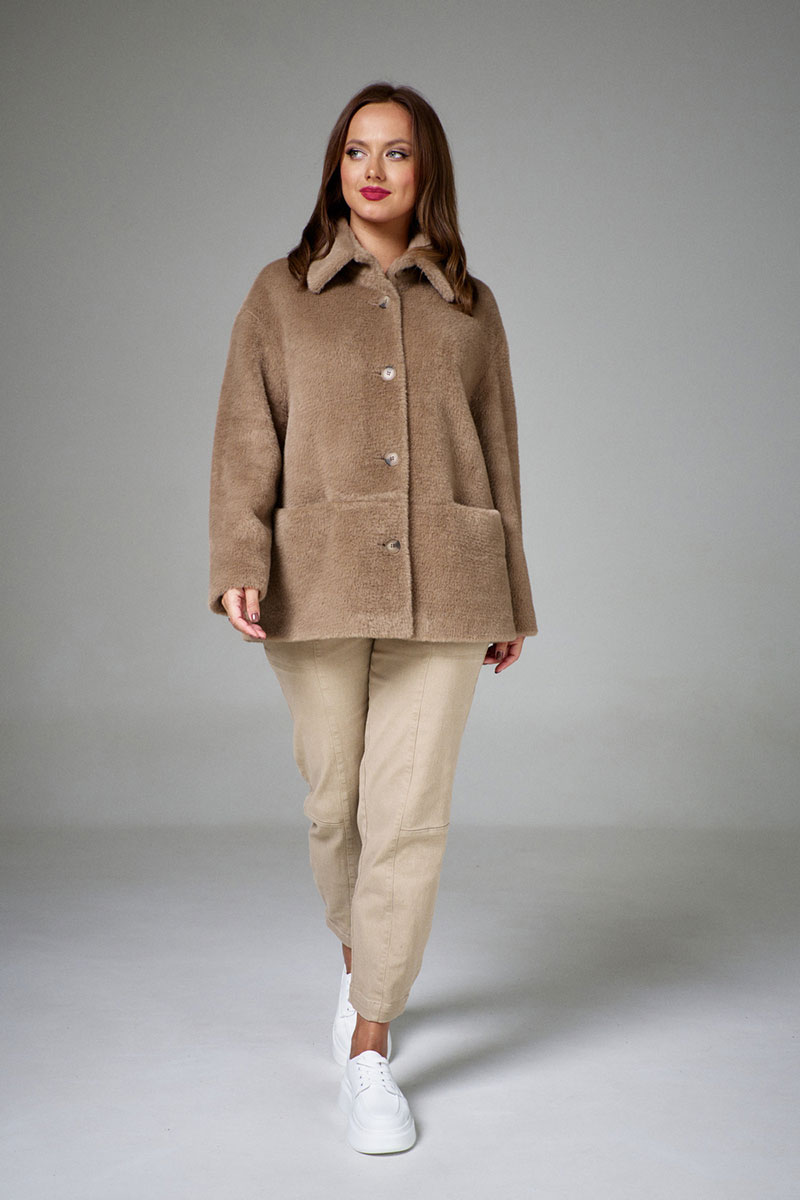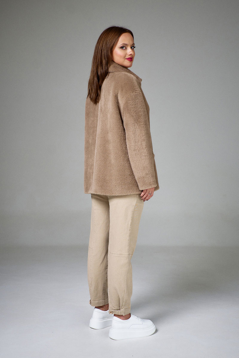 Укороченное пальто из мягкого коротковорсового меха на трикотажной основе, слегка расширенного силуэта, застежкой на пуговицы и отложным воротником со стойкой. Рукав длинный, линия плеча спущена. На переде карманы в горизонтальных швах. Изделие на подкладке.