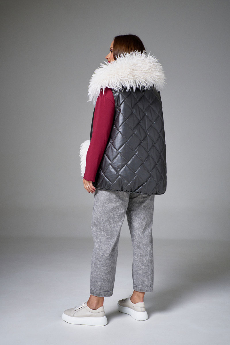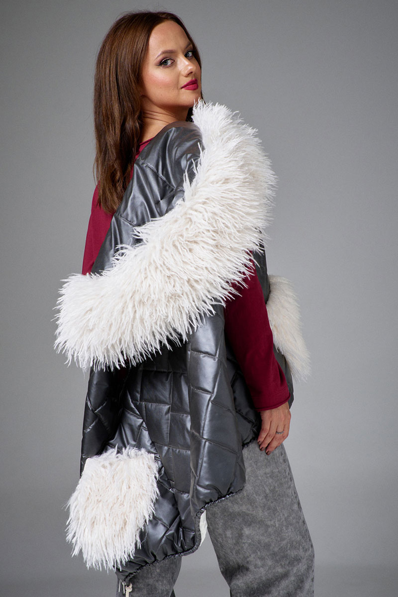 Стеганый жилет из перламутровой плащевки с утеплителем, расширенного силуэта, застежкой на молнию и объемным капюшоном. Накладные карманы и отделка капюшона из длинноворсного шелковистого экомеха под ламу. Ширина изделия по низу регулируется кулисо со шнуром. Изделие на подкладке.