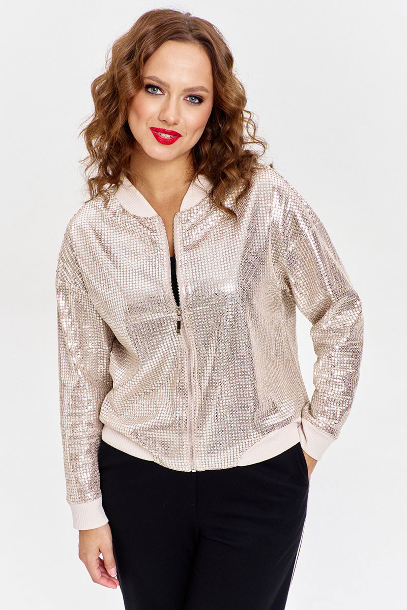 Бомбер из сетки с пайетками, свободного силуэта, с длинным рукавом и застежкой на молнию спереди. Стойка горловины, манжеты рукавов и и низа из трикотажного довяза. Изделие на подкладке.