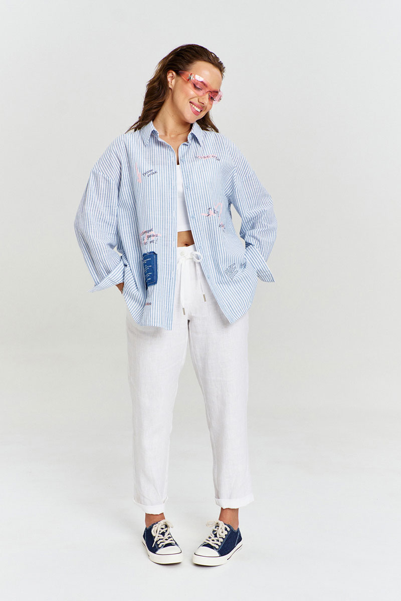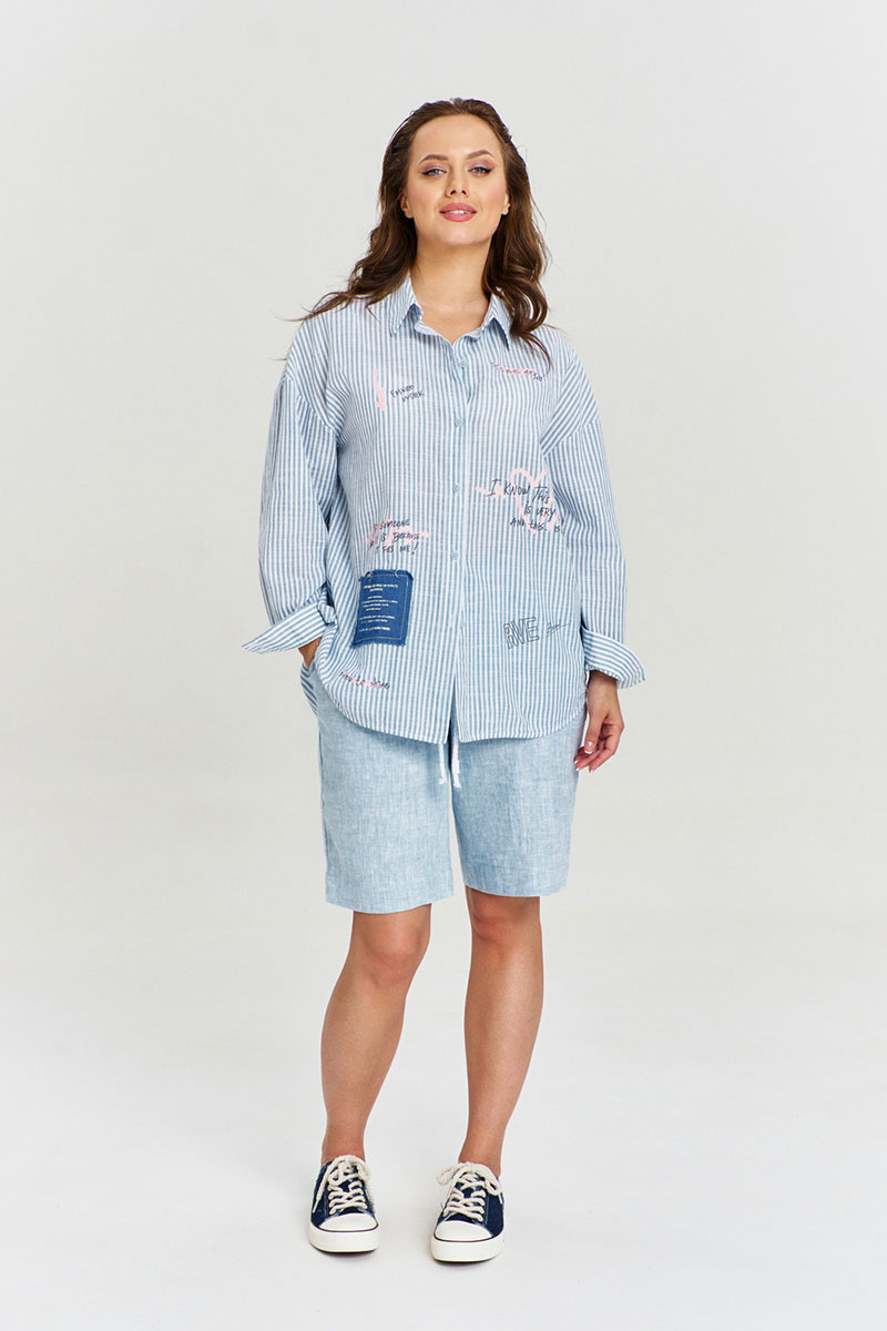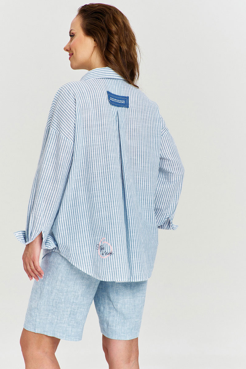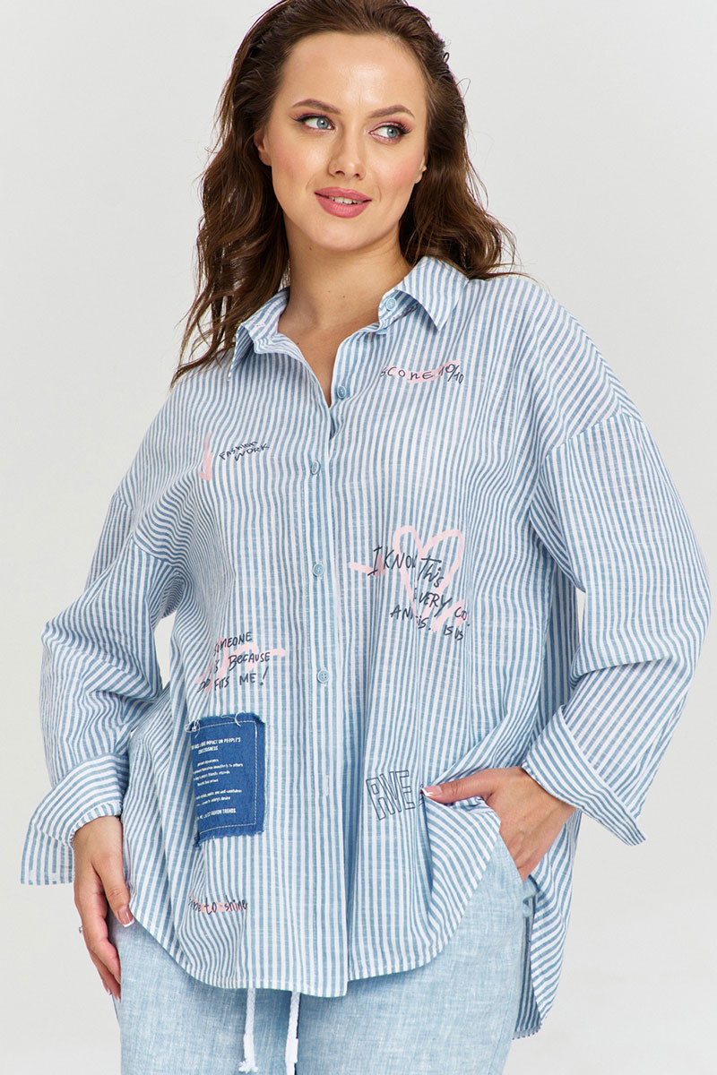 Рубашка из 100% хлопковой ткани в полоску, свободного силуэта, со спущенной линией плеча и длинным рукавом с манжетой. Застежка спереди на пуговицы. Спинка с глубокой встречной складкой. Воротник рубашечный. Изделие декорировано авторскими принтами и джинсовыми нашивками с необработанными срезами.