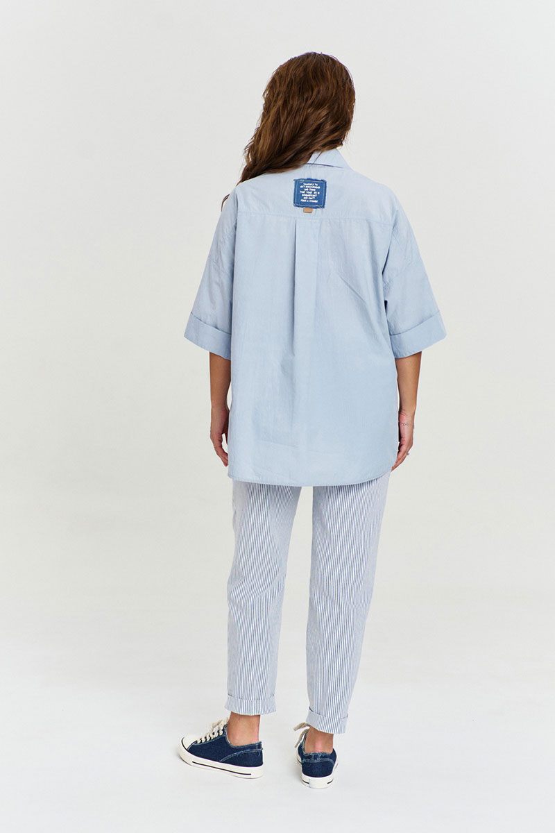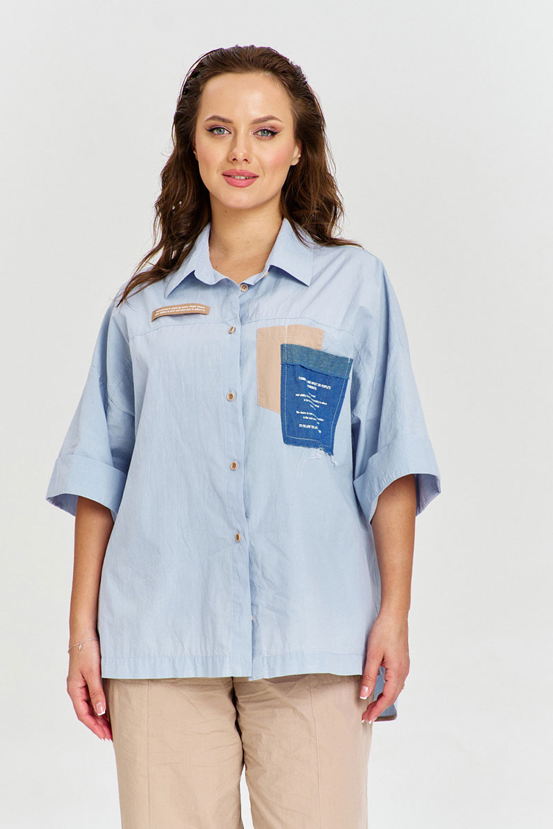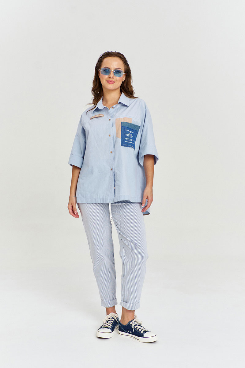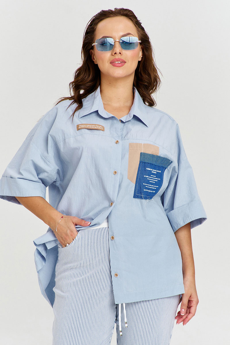 Рубашка из 100% хлопковой ткани с легким крэш эффектом, свободного силуэта, удлиненной спинкой, застежкой на пуговицы спередии рубашечным воротником. Спинка с отрезной кокеткой и бантовой складкой. Линия плеча спущена, рукав широкий, короткий, с отложной манжетой. На переде отрезные кокетки и декоративные накладные карманы из отделочных материалов с авторским принтом.