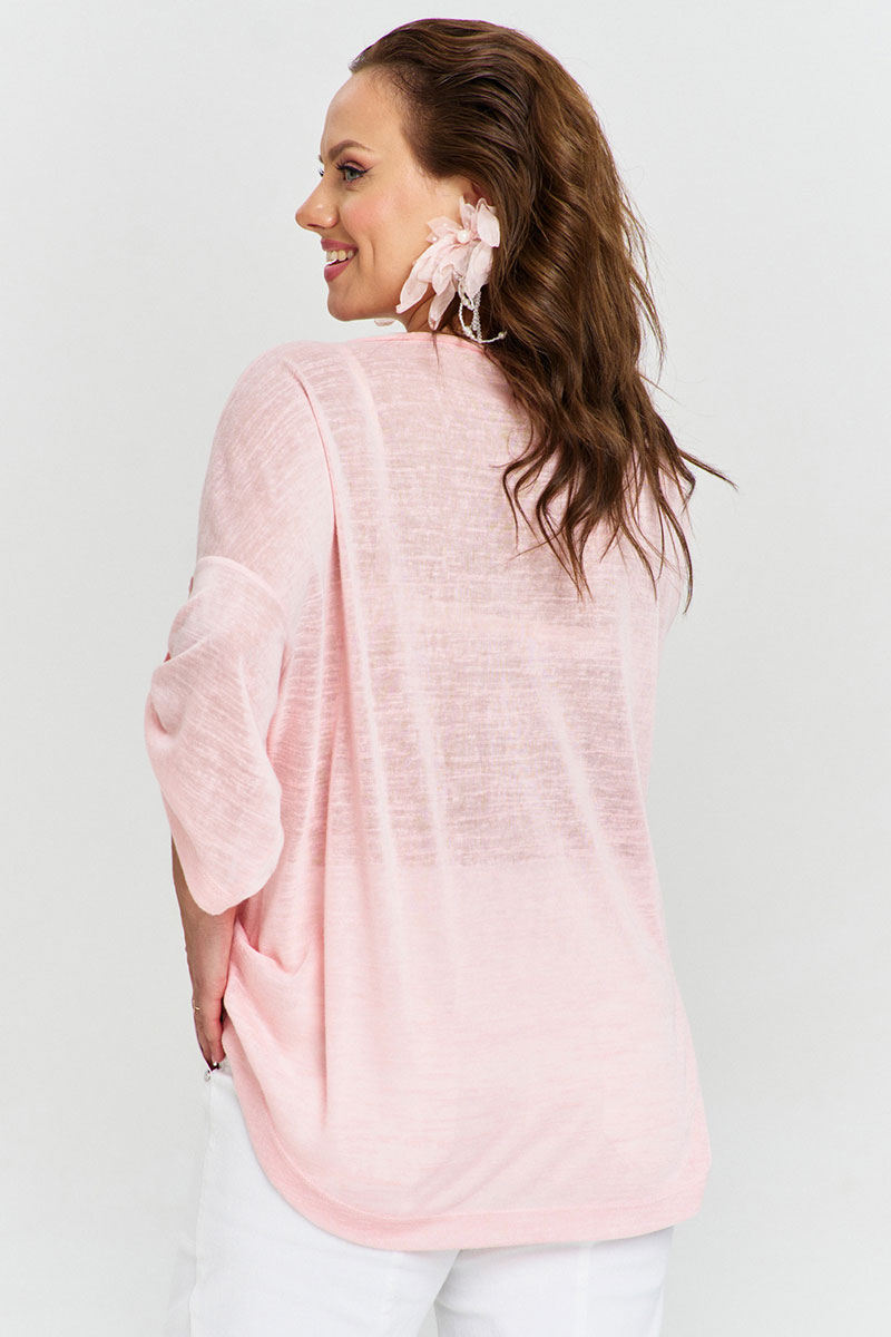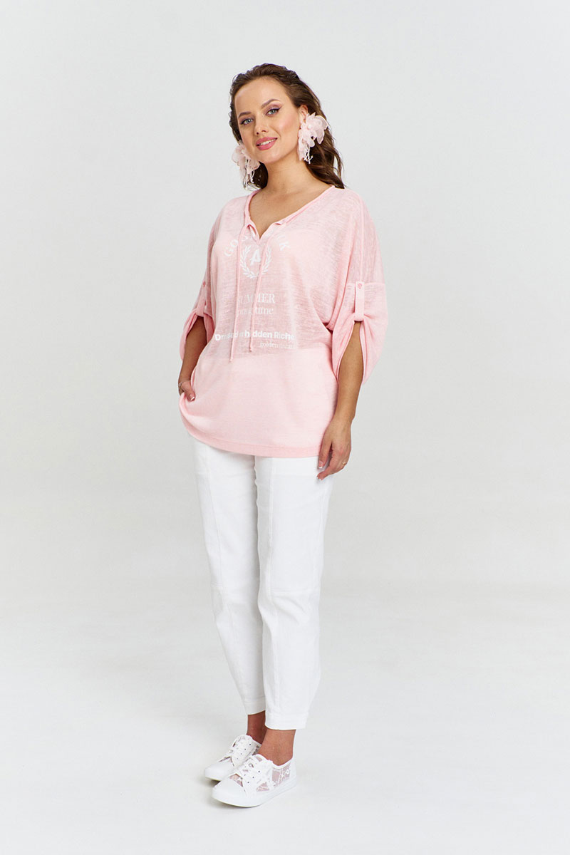 Джемпер из тонкого вискозного трикотажа, свободного силуэта, с круглой горловиной и V-образным вырезом со шнурами. Линия плеча спущена. Рукав 3/4, широкий, регулируется при помощи хлястика. Перед с авторским принтом.