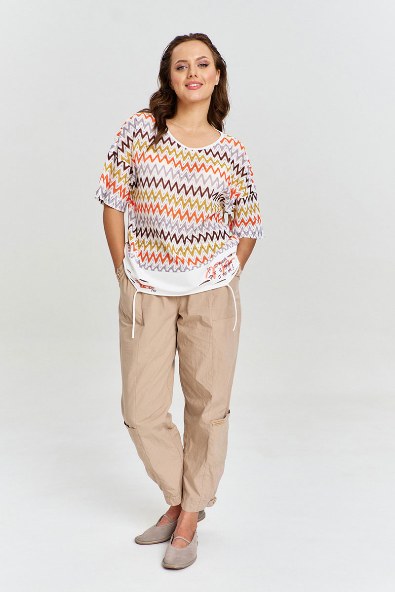 Джемпер из гипюра с геометрическим узором, свободного силуэта, с коротким рукавом и V-образной горловиной. По низу изделия притачная планка из отделочного трикотажа с декоративными прорезями и необработанными срезами. Планка декорирована авторским принтом.