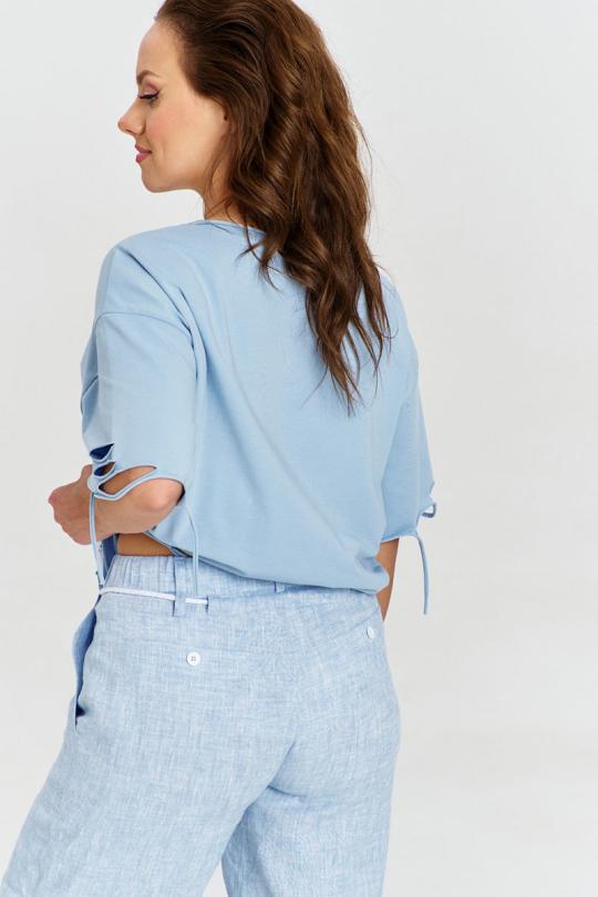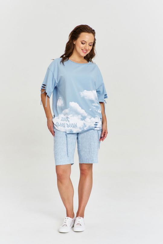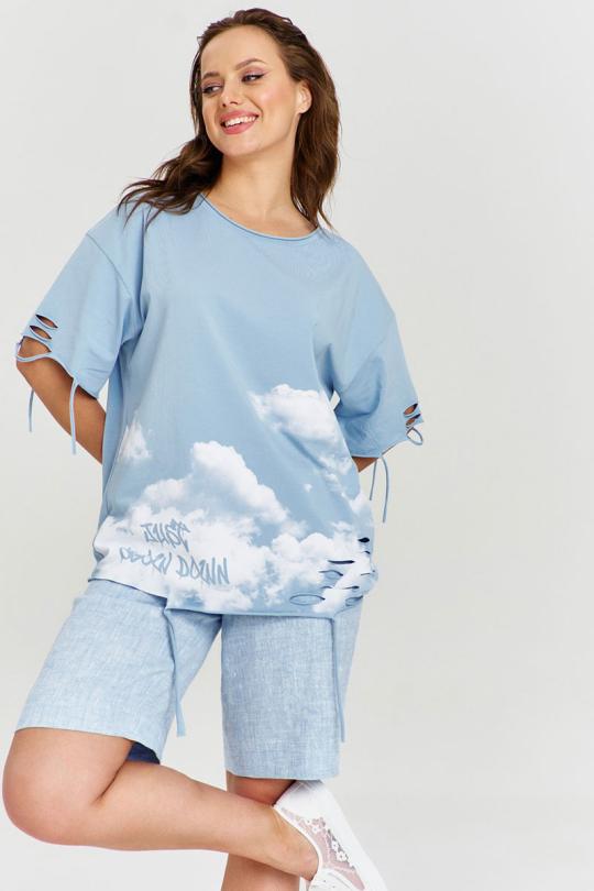 Футболка из хлопковой кулирки, умеренный оверсайз, со спущенным плечом и коротким рукавом. Вырез горловиныкруглый, с необработанной бейкой. Перед декорирован авторским принтом и эффектными прорезями.