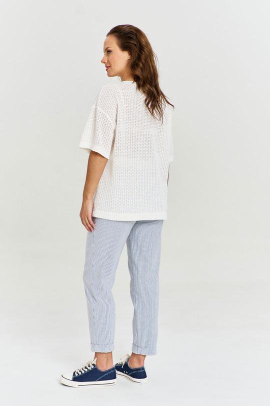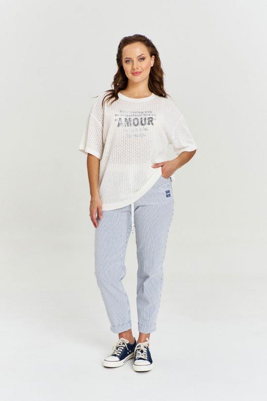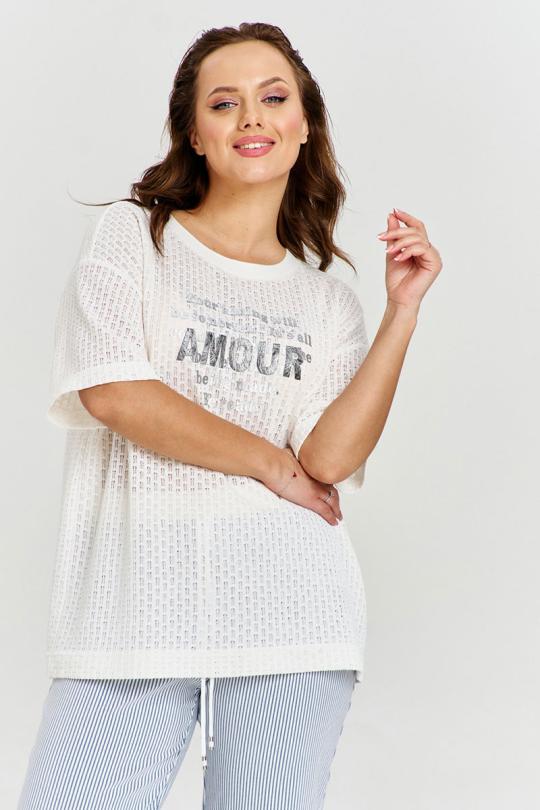 Джемпер из ажурного вискозного трикотажа, свободного силуэта, с коротким рукавом и круглой горловиной с декоративным довязом. На переде изделия авторский объемный принт.