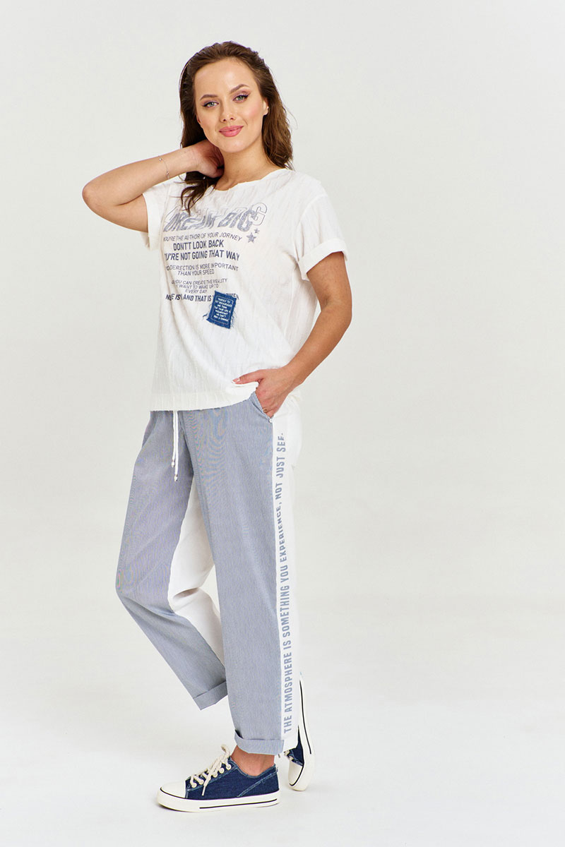 Футболка из вискозного трикотажа с фактурой "дырочки", свободного силуэта с коротким рукавом и круглой горловиной. На переде авторский принт и джинсовая нашивка с необработанным срезом.