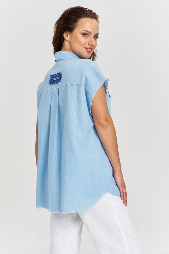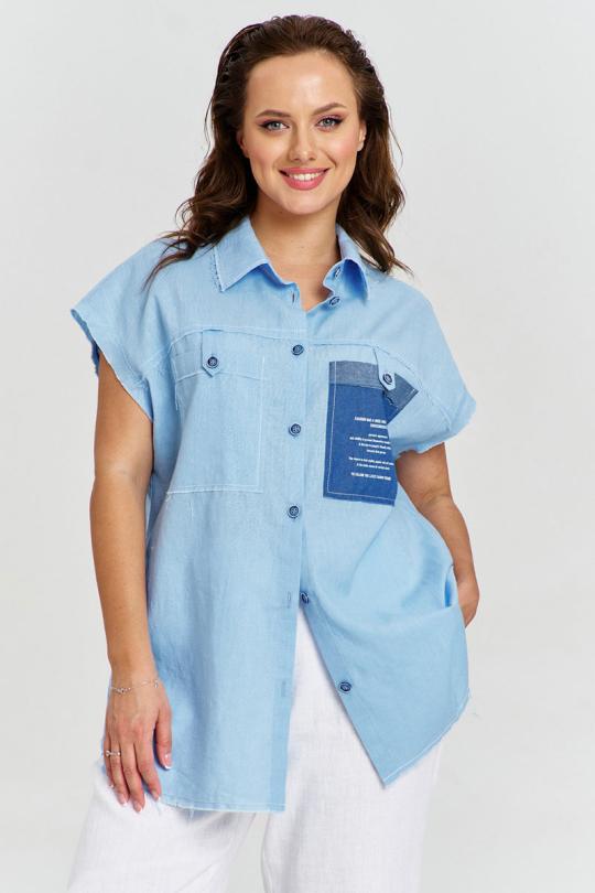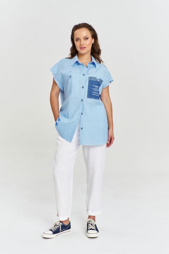 Рубашка из льняной ткани, свободного силуэта, удлиненной спинкой, застежкой на пуговицы спереди и рубашечным воротником. Спинка с отрезной кокеткой и бантовой складкой. Рукав короткий, цельнокроеный. На переде отрезные кокетки и накладные карманы с авторским принтом. Некоторые швы изделия необработаны, при энзимной стирке обретают стильную вытрепанность.