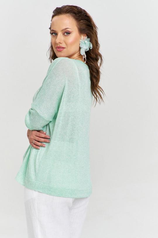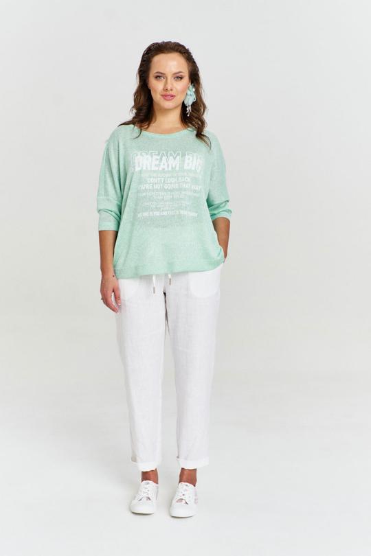 Джемпер из тонкого вискозного трикотажа, свободного силуэта, "оверсайз", с круглой горловиной с отрезной бейкой. Линия плеча спущена. Рукав 3/4, зауженный. На переде авторский принт.