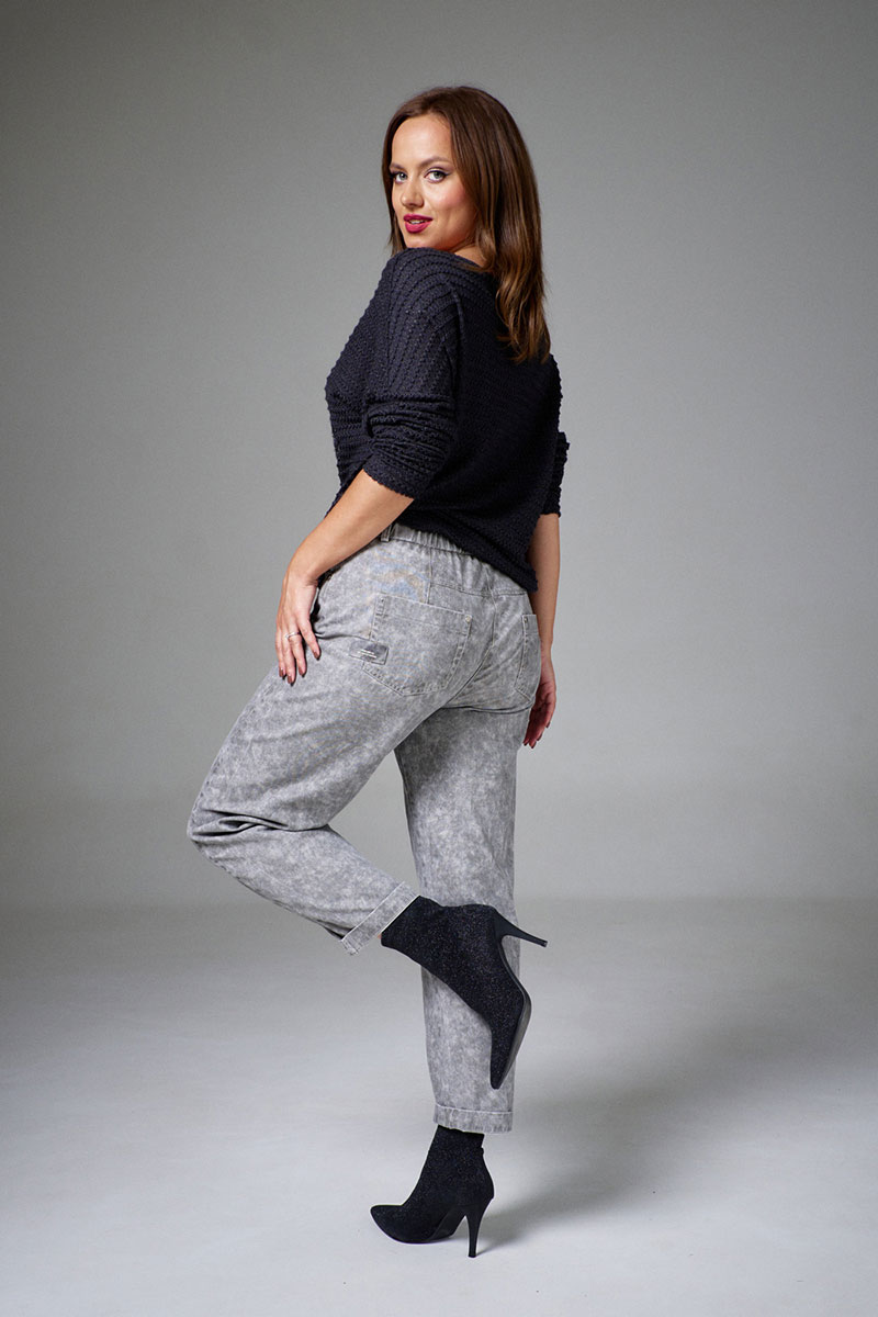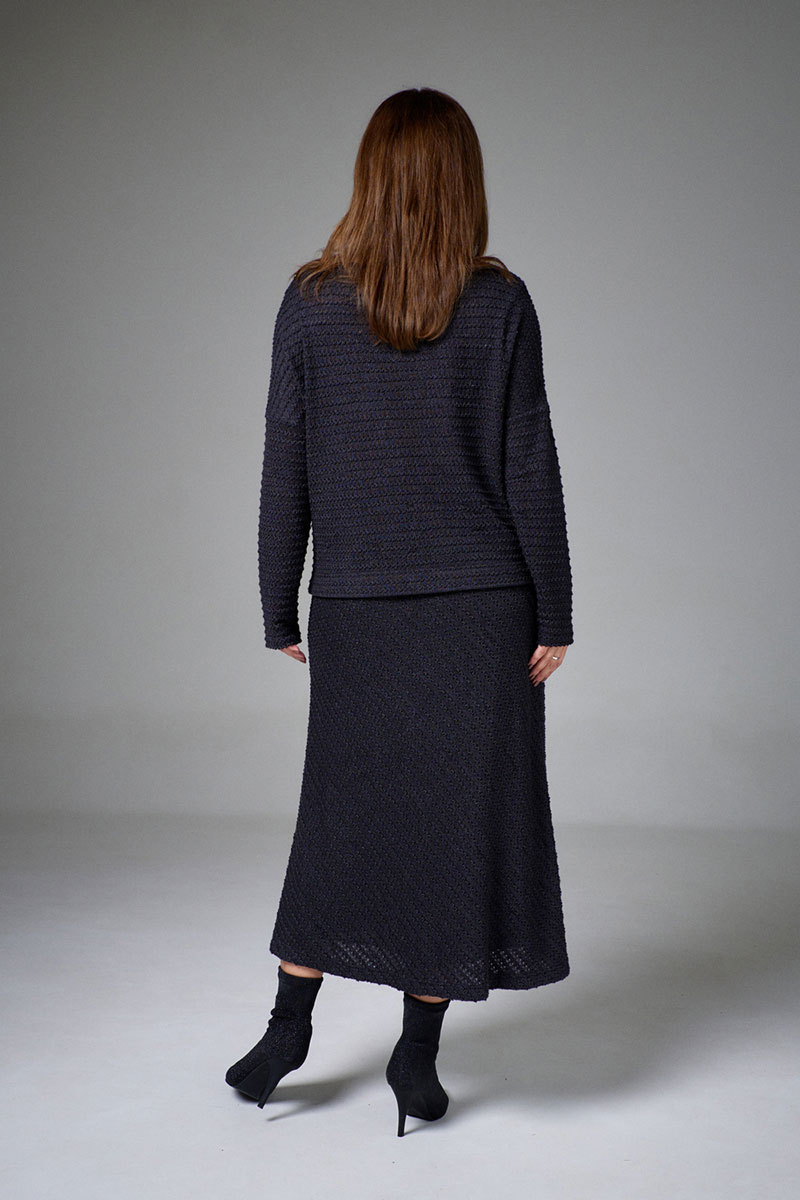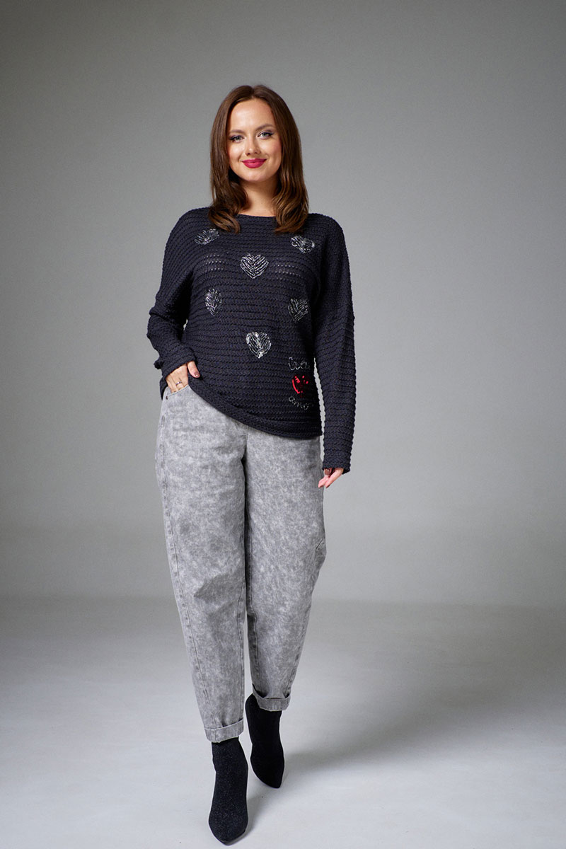 Джемпер из ажурного трикотажа, свободного силуэта, с длинным рукавом и горловиной "лодочка". Перед изделия декорированавторской вышивкой с применением пайеток и серебристых нитей.