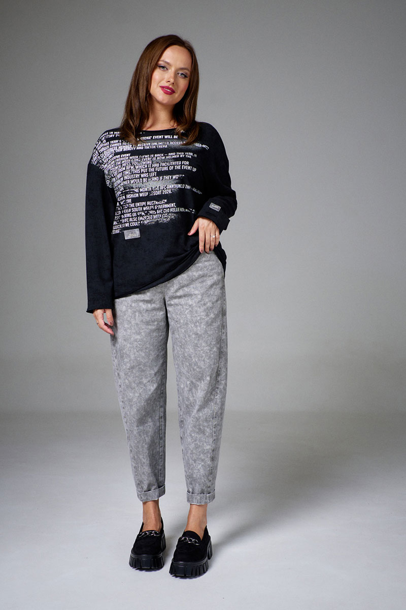 Лонгслив из хлопковой кулирки, свободного силуэта, с длинным рукавом и круглой горловиной. На переде авторский принт. По низу изделия и рукава декоративные прорези.