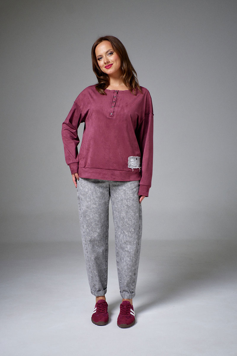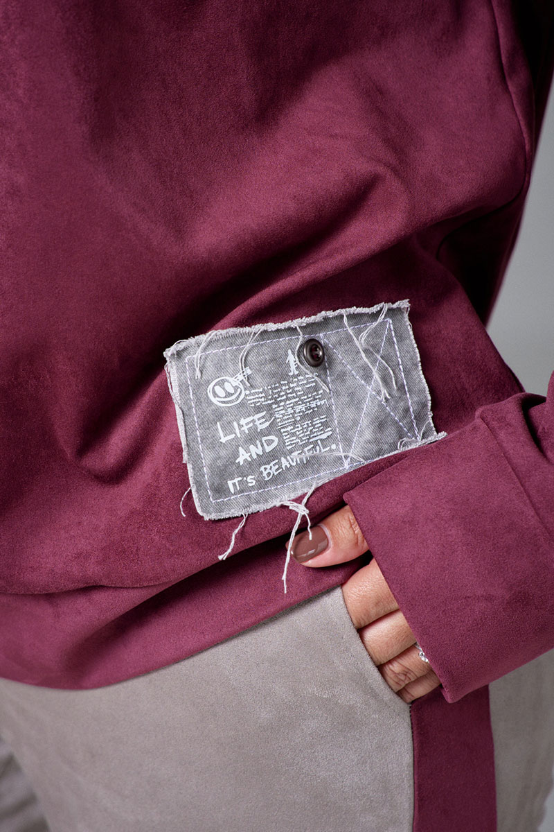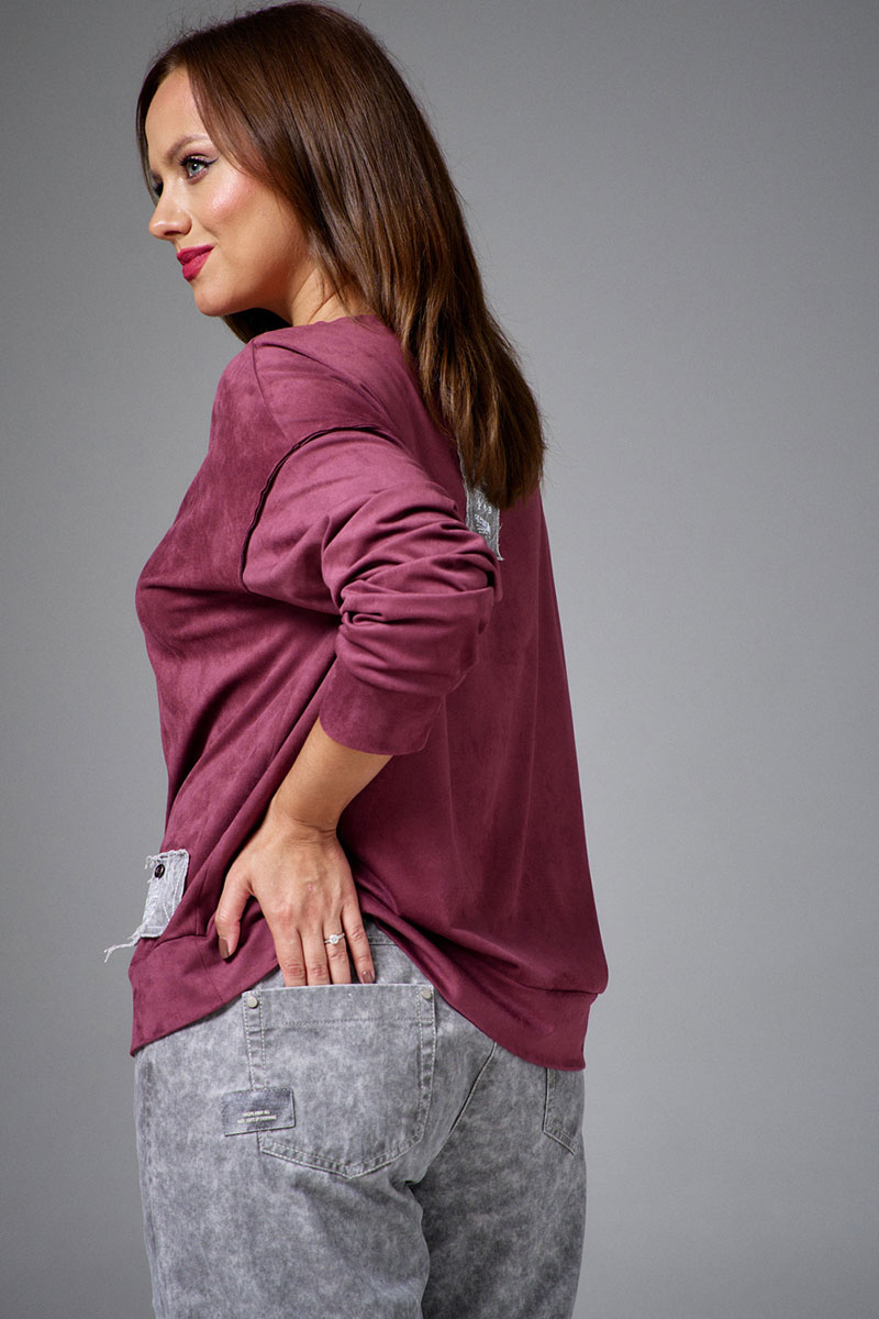 Свитшот из мягкой и пластичной экозамши, свободного силуэта, с длинным рукавом и круглой горловиной. По низу рукавов и изделия притачные манжеты. На переде декоративная планка, имитирующая застежку на пуговицы. Свитшот декорирован принтованными авторскими нашивками из джинса с необработанными срезами.