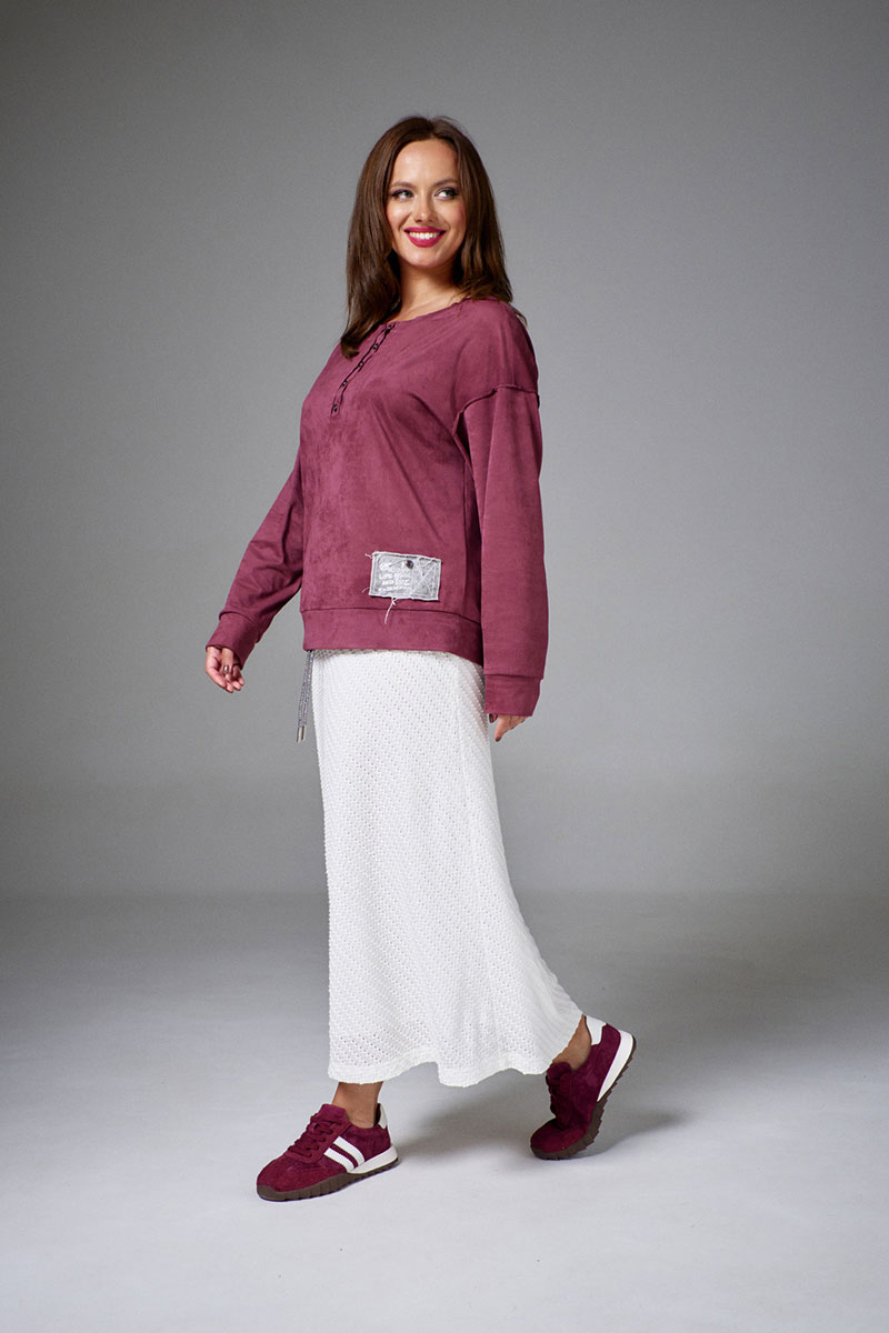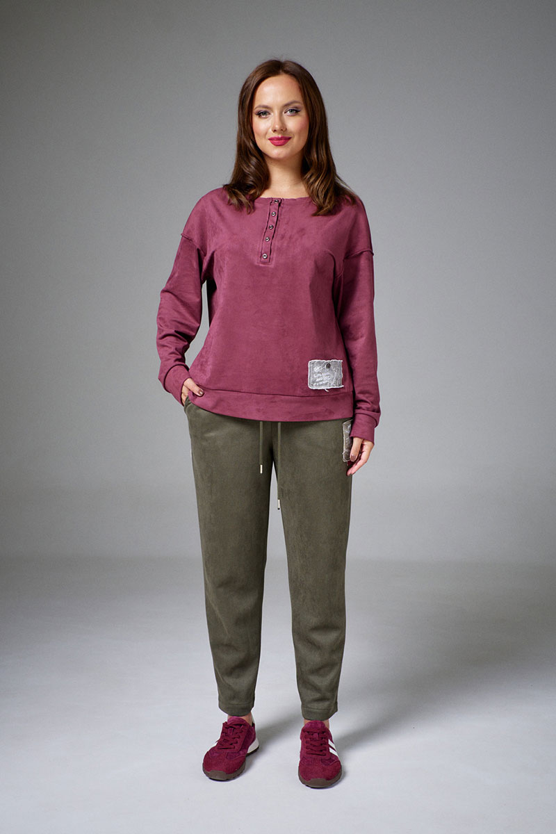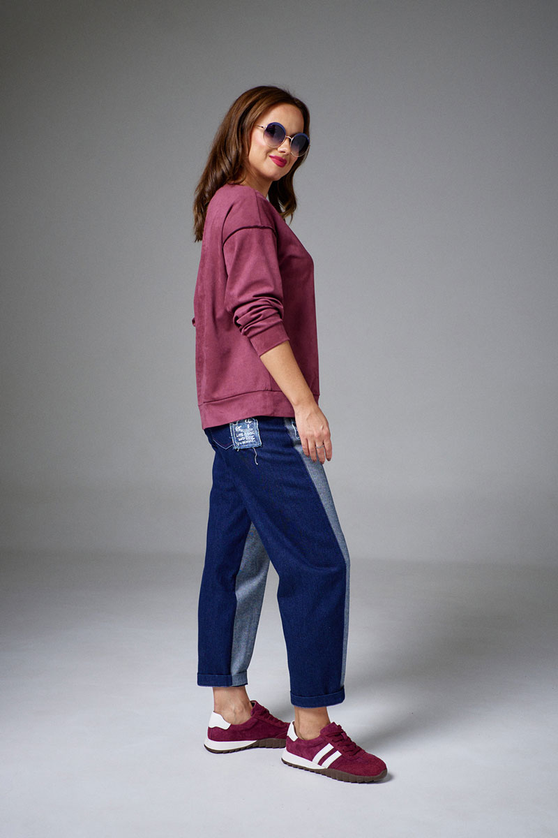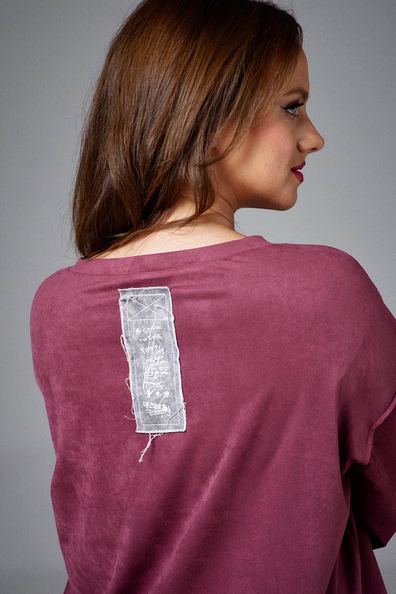 Свитшот из мягкой и пластичной экозамши, свободного силуэта, с длинным рукавом и круглой горловиной. По низу рукавов и изделия притачные манжеты. На переде декоративная планка, имитирующая застежку на пуговицы. Свитшот декорирован принтованными авторскими нашивками из джинса с необработанными срезами.