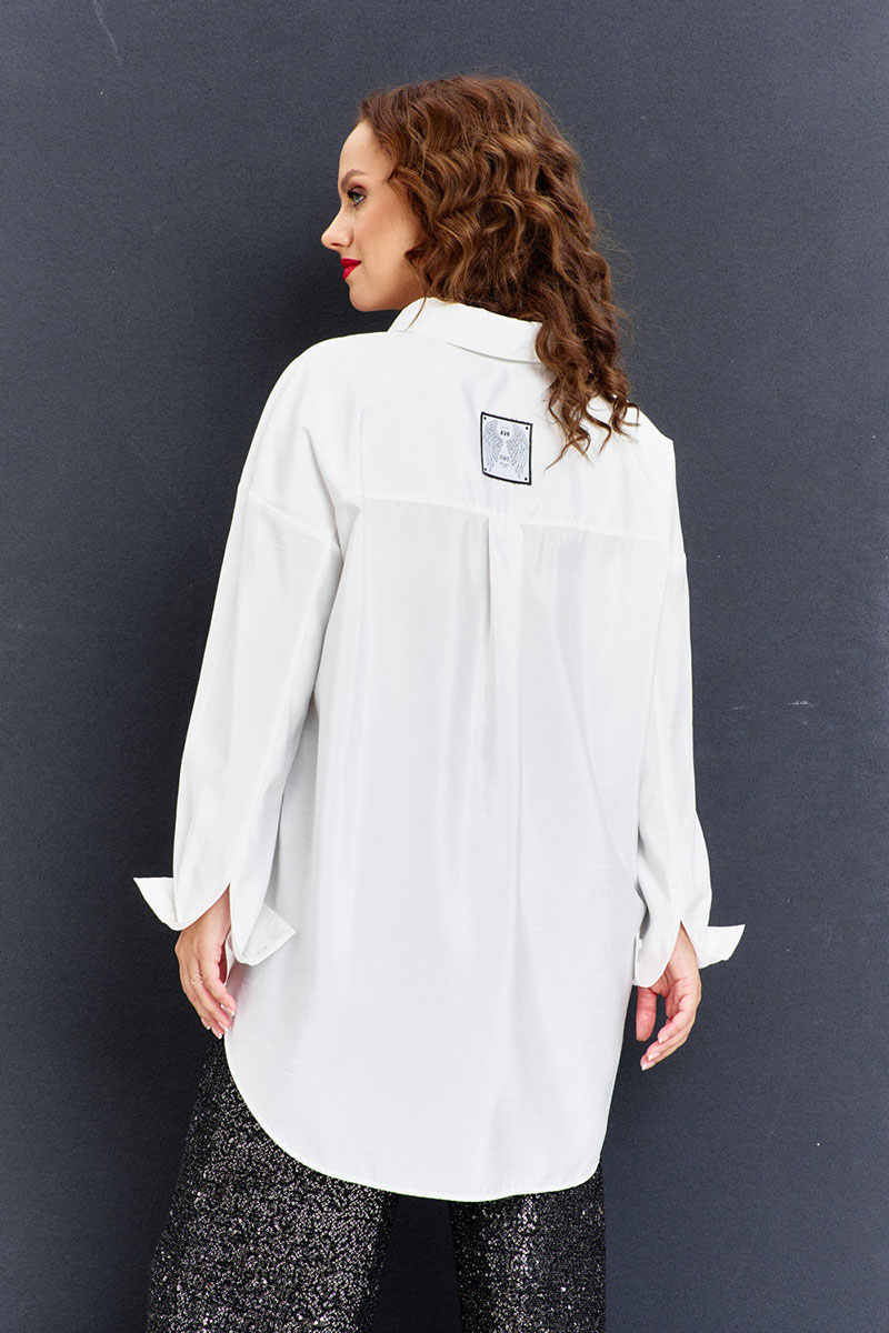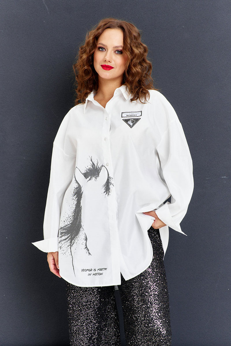 Рубашка свободного силуэта, с застежкой на пуговицы спереди, с длинным рукавом и рубашечным воротником. Спинка с отрезной кокеткой и бантовой складкой. Изделие декорировано авторским принтом и нашивками.