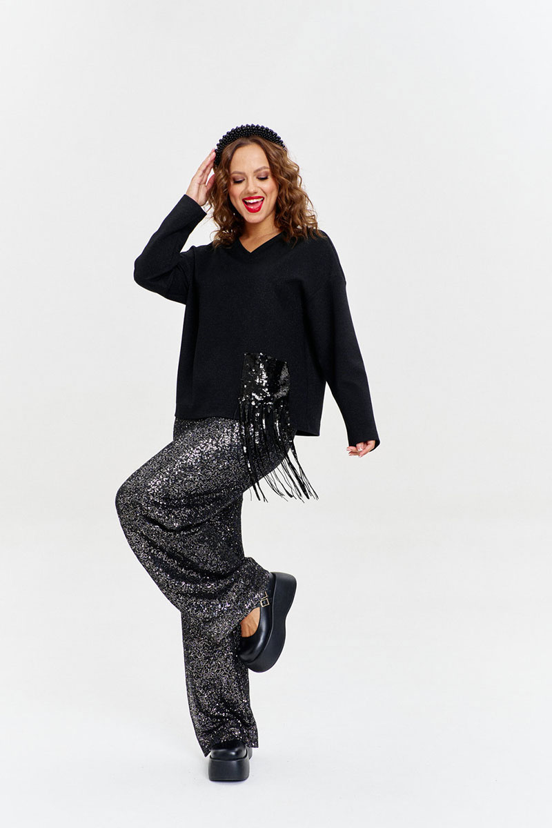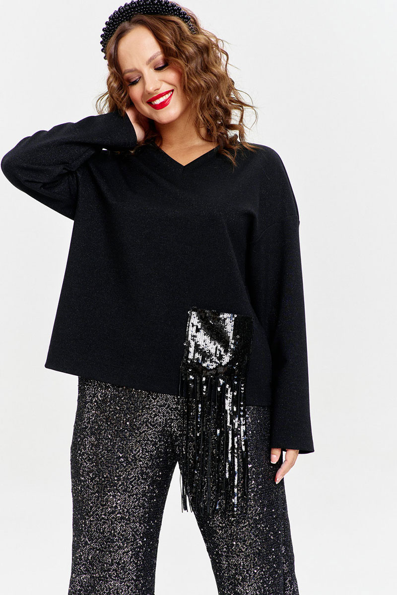 Джемпер из трикотажас легким мерцанием, свободного силуэта, с длинным рукавом и V-образной горловиной. На переде эффектный накладной карман из пайеток с бахромой.