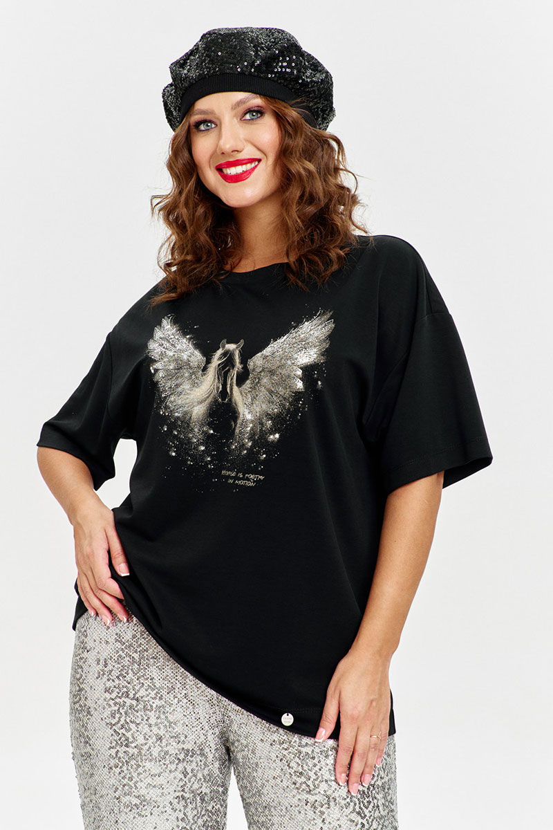 Футболка из вискозного трикотажа, свободного силуэта, с коротким рукавом и круглой горловиной. Перед изделия декорирован авторским принтом.